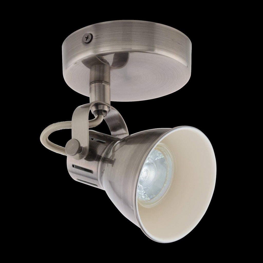 The SERAS LED wall and ceiling light has a metal mount in antique nickel and an adjustable metal spotlight with a cream-coloured inner surface. The ceiling spotlight’s trendy look perfectly compliments modern interiors and provides focused lighting in the kitchen, living room, bedroom, hallway or dining room. The product includes the pictured GU10 LED lightbulb, which produces a pleasant warm white light.