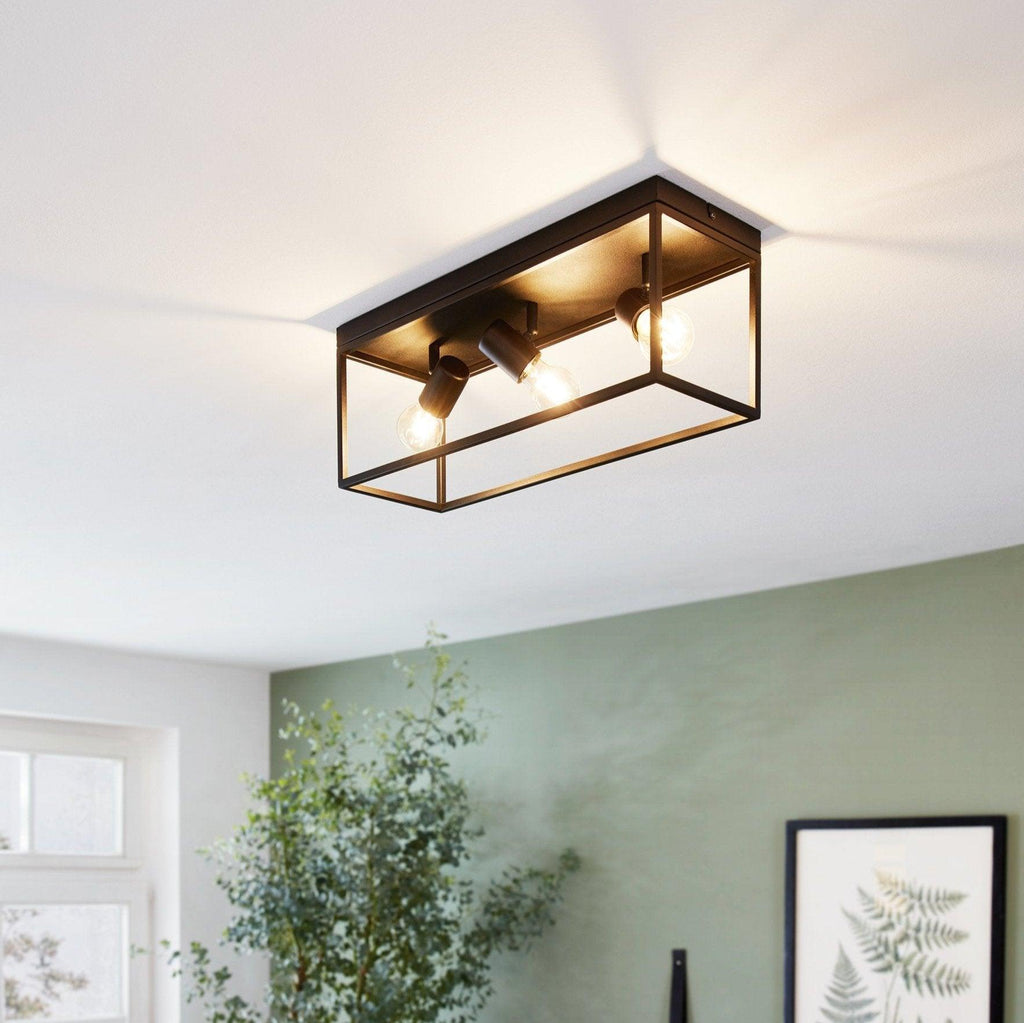 The SILENTINA ceiling light has a cube-shaped metal frame in a black finish. The design has a visible lightbulb style. The ceiling light perfectly complements modern interiors and provides lighting that works well in the kitchen, living room, bedroom or hallway. The pictured filament lightbulbs are not included. The product has E27 lamp holders and requires E27 lightbulbs.