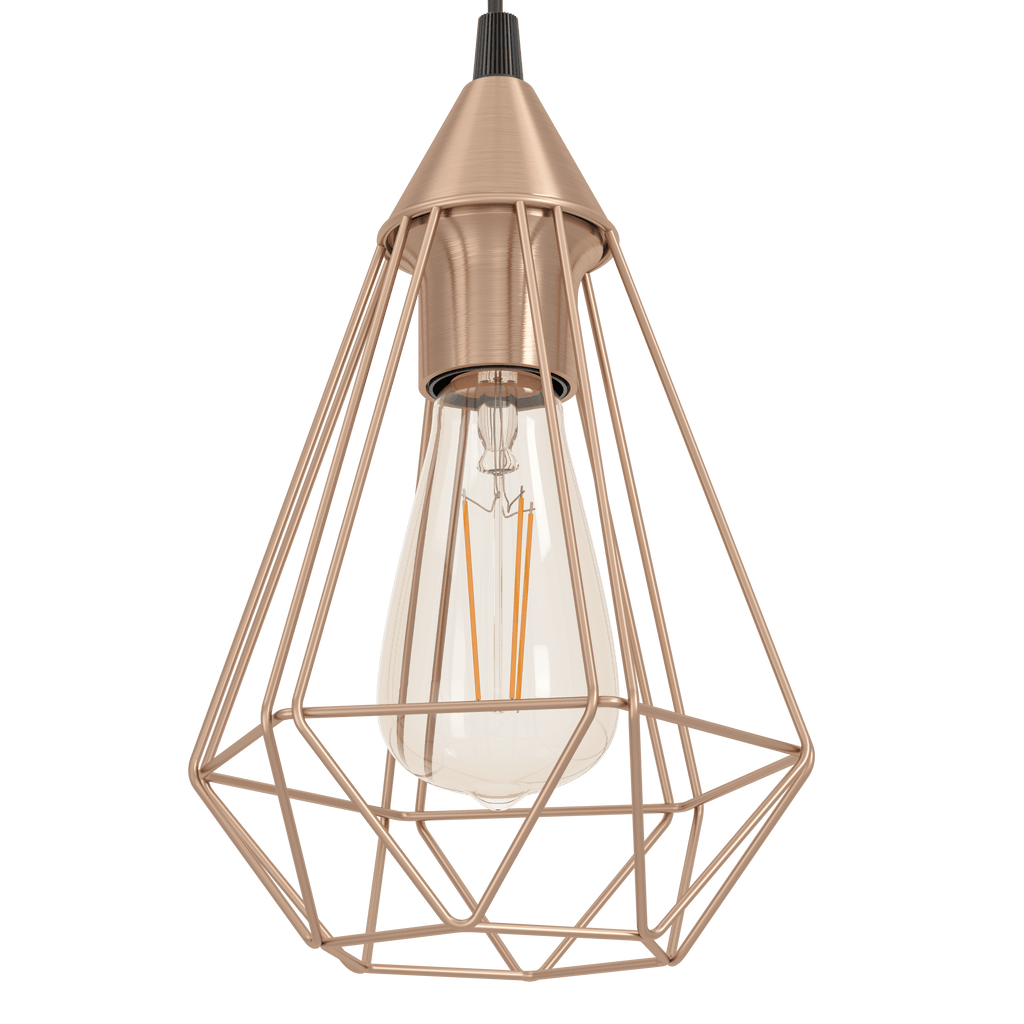 The TARBES pendant light has three copper-coloured wire lampshades in a delicate diamond shape and a long black ceiling mount. When the light is on, it creates a fascinating play of light and shadows through the geometric design. The modern pendant light provides stylish lighting for any space, whether in the living room or over a long table in the dining room. The pictured filament lightbulbs are not included. The product has E27 lamp holders and requires E27 lightbulbs.