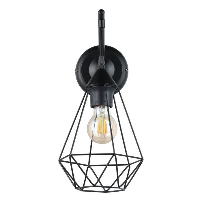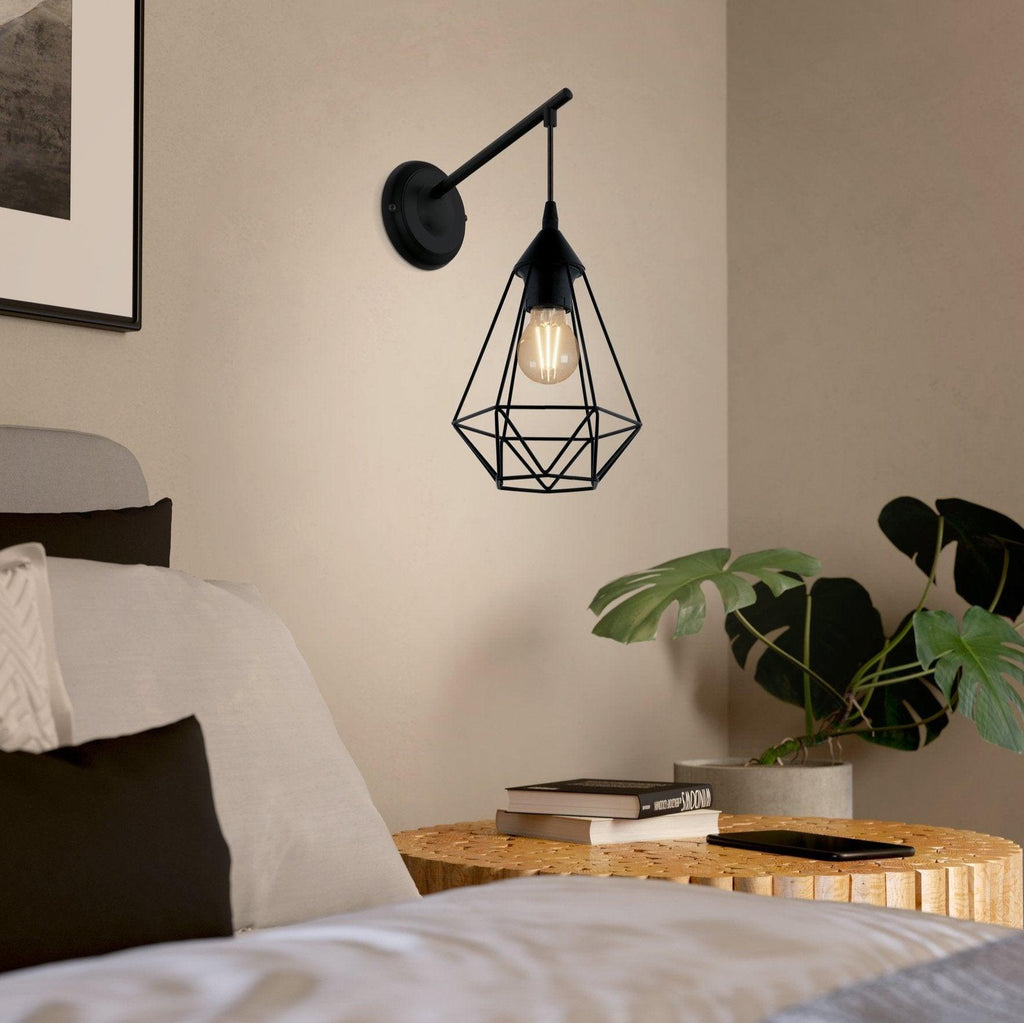The TARBES wall light features a round black metal wall mount and a long black arm. The product has a wire lampshade in a delicate diamond shape. When the light is on, it creates a fascinating play of light and shadow through the geometric design. The modern wall light provides a stylish lighting solution for any space, whether in the kitchen, living room, bedroom, hallway or dining room. The pictured filament lightbulb is not included. The product has an E27 lamp holder and requires an E27 lightbulb.