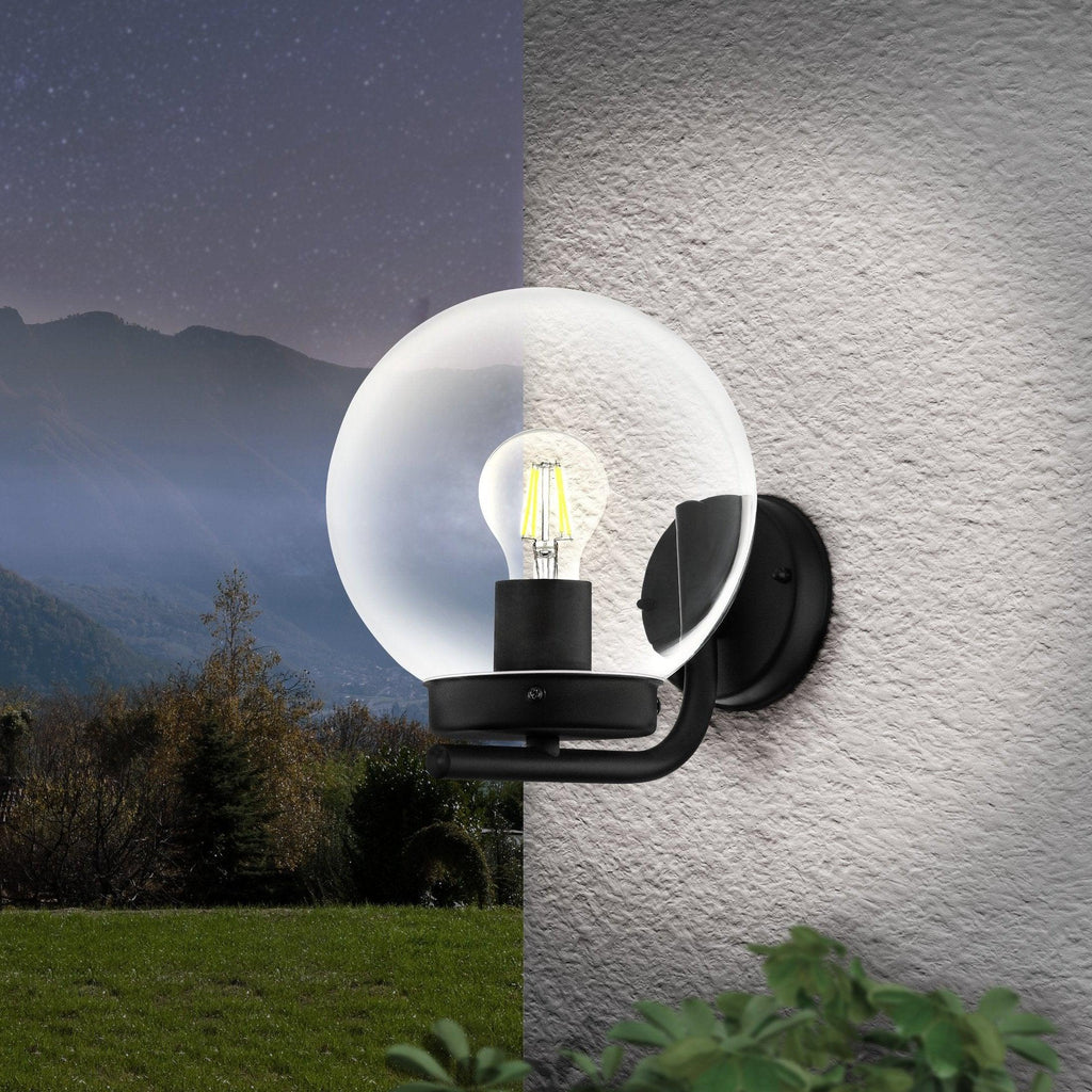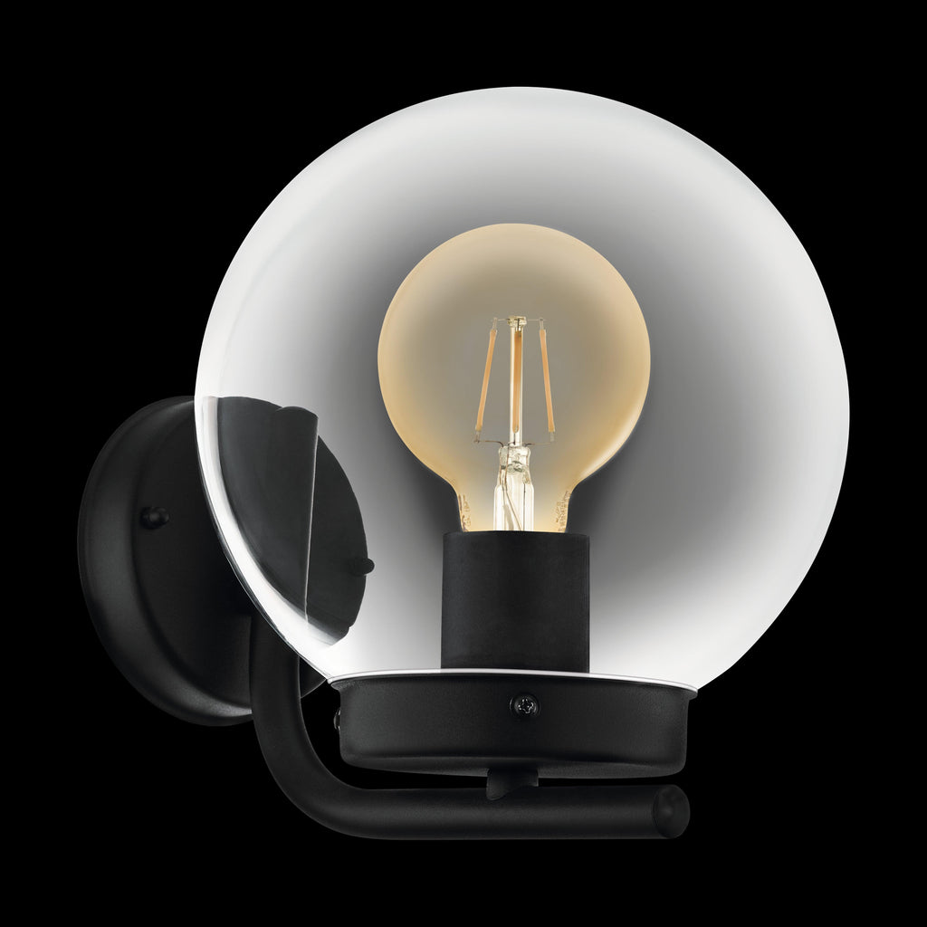 The TAVERNA exterior wall light has a black zinc-plated metal body with a clear plastic dome. This dome can be mounted upright or in a hanging position. The design has a visible lightbulb style. The product is suitable for outdoor use due to its IP44 protection against spray water, and the modern style will beautifully complement your outdoor space. The pictured filament lightbulb is not included. The product has an E27 lamp holder and requires an E27 lightbulb.