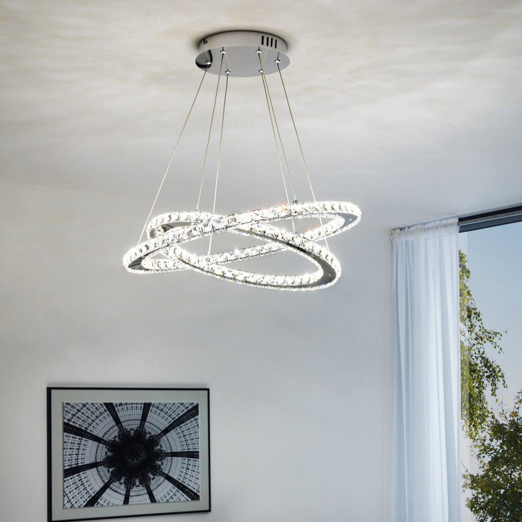 The VARRAZO pendant light features two chrome-coloured metal rings, one inside the other, decorated with clear crystals arranged in tight rows. The integrated LEDs behind the crystal elements produce a neutral white light and create a sparkling, high-end look when the light is on. The design has six cables and a round chrome-coloured metal canopy. The pendant light works beautifully in modern interiors and provides an elegant, eye-catching feature in the living room or dining room above the dining table.