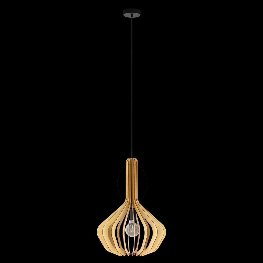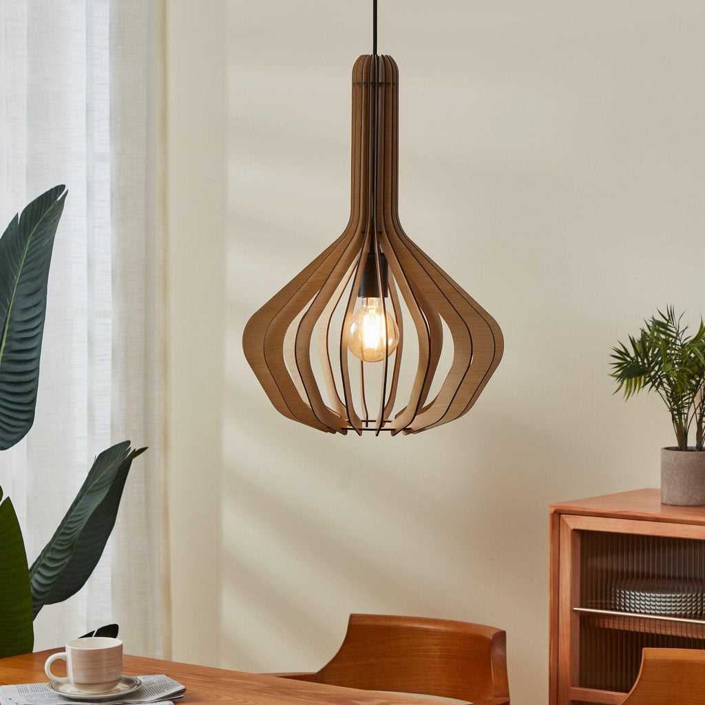 The VELASCO pendant light has a rounded lampshade made of maple-coloured wood segments, a black textile cable and a black metal canopy. The wooden segment design creates a fascinating play of light and shadow when the light is on. The pendant light has a diameter of 38 cm and a Scandi design, which complements modern interior design styles and provides welcoming lighting in the living room, bedroom or dining room. The pictured filament lightbulb is not included. The product has an E27 lamp holder and requires an E27 lightbulb.