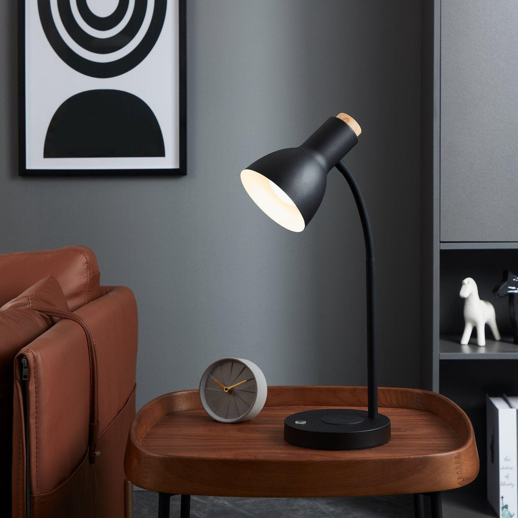 The VERADAL-QI LED table lamp combines both form and function. The light features a black steel structure with wooden accents and offers a built-in QI-charging function and touch dimmer. The integrated LEDs produce a pleasant warm white light, offering focused lighting for your home. The table lamp's classic design complements various interior styles, whether in the living room, bedroom on the bedside table, or in the hallway on a sideboard.
