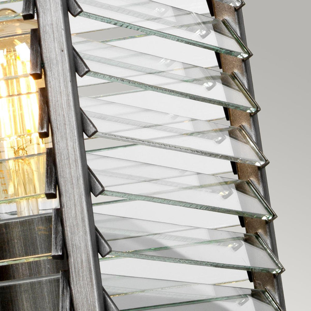 The Louvre range's attention grabbing form materialises from the Juxtaposition between the subtleness of it's soft silver/brushed black finish and hard angular slats of clear glass. Filament style lamp bulbs finish the appearance, completing the gentle industrial aesthetic.