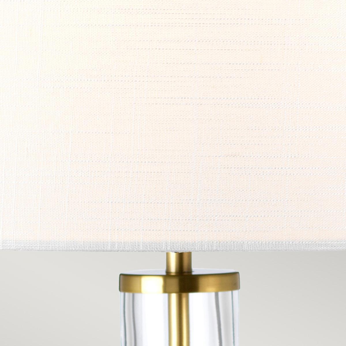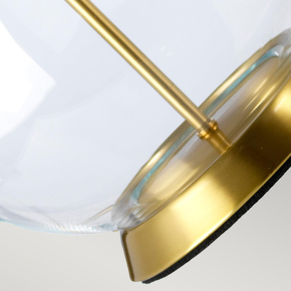 The Orb Table lamp has a classic shape with a modern twist. The clear glass orb topped and tailed by Aged Brass metal work, is completed with a faux Linen White drum shade.