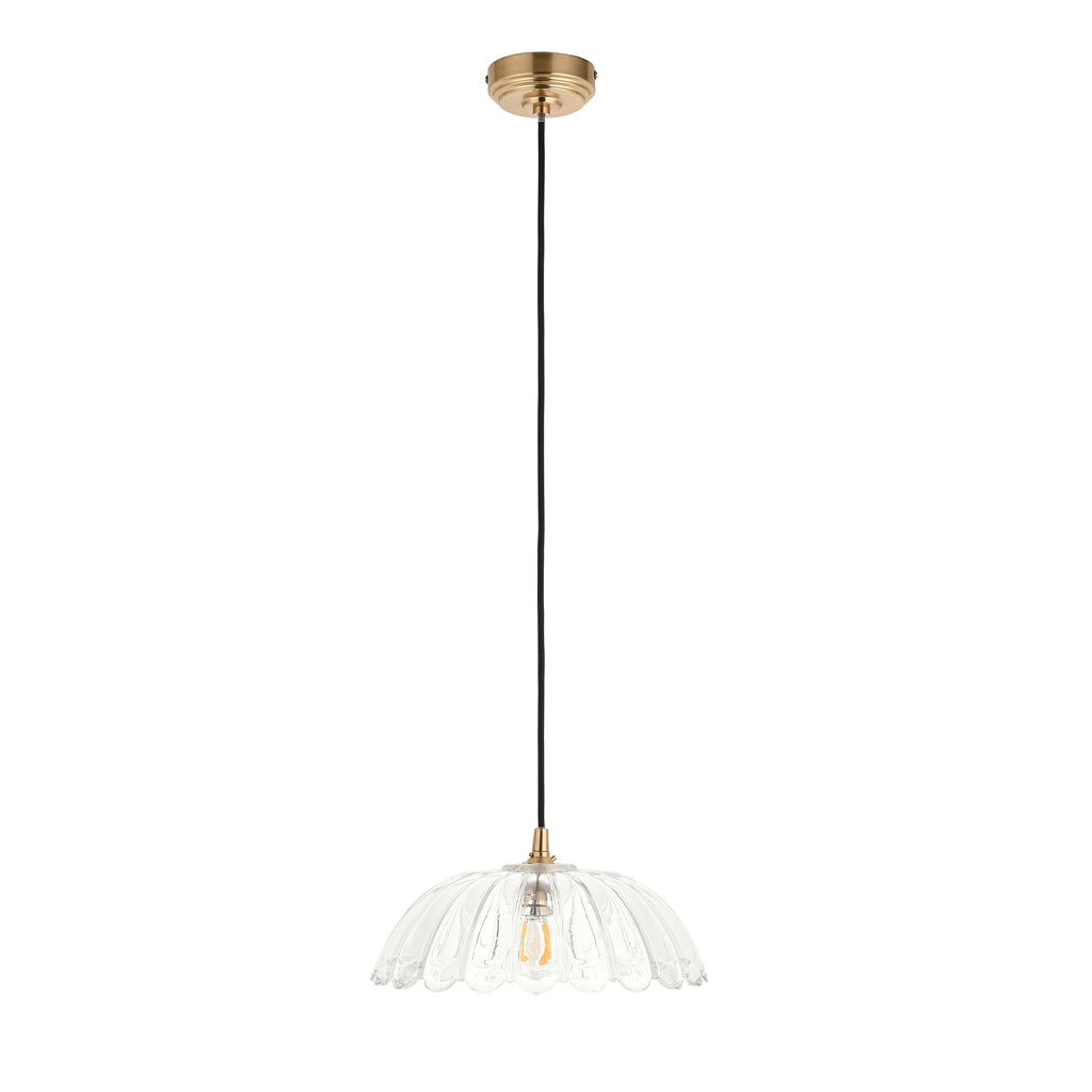 Elegant and timeless, this decorative heavy clear glass shade takes inspiration from classic French design, featuring a gentle dome scalloped form that diffuses light beautifully while adding artistic charm. Suspended from a classically styled black braided fabric flex set with warm brass details, adding vintage sophistication to any room. Ideal for kitchens, hallways, or bedrooms.
