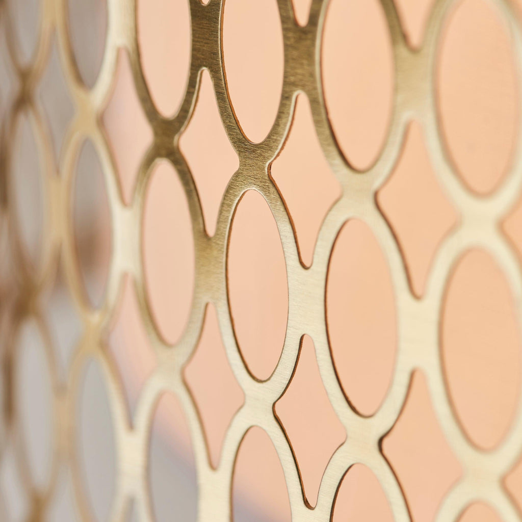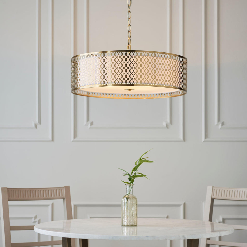 A classic circular light with a trendy geometric fretwork metal outer and an inner fabric shade for lovely light diffusion. As well as being dimmable this product has a height adjustable rope chain so it can be hang to best illuminate the space and create atmosphere.