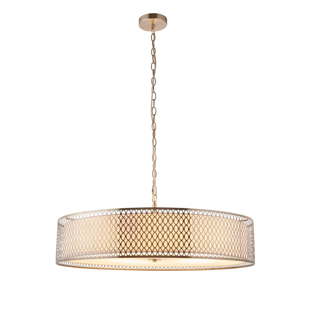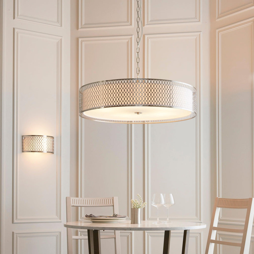 An impressive classic circular pendant with an elegant geometric metal fretwork outer, finished in satin nickel with an inner fabric shade for lovely light diffusion, complete with a frosted glass diffuser to complete the look. Matching items available.