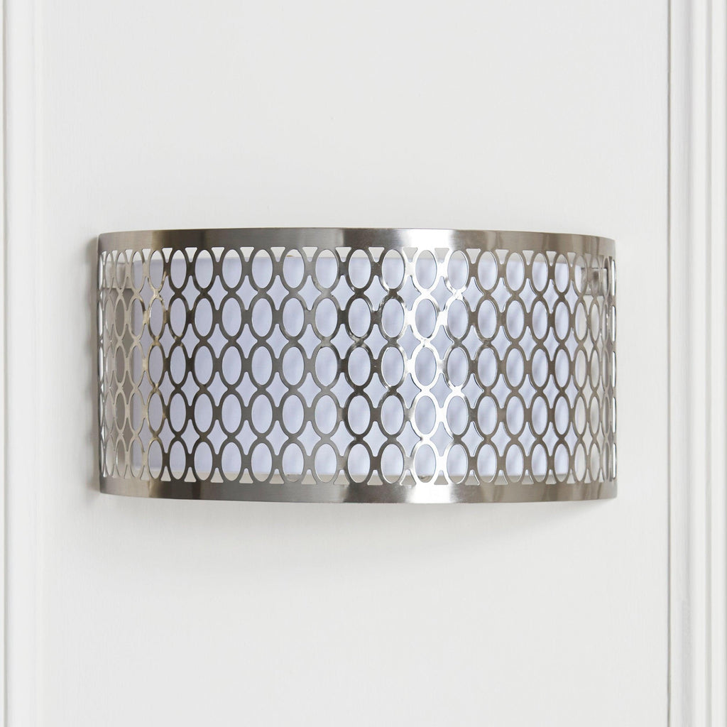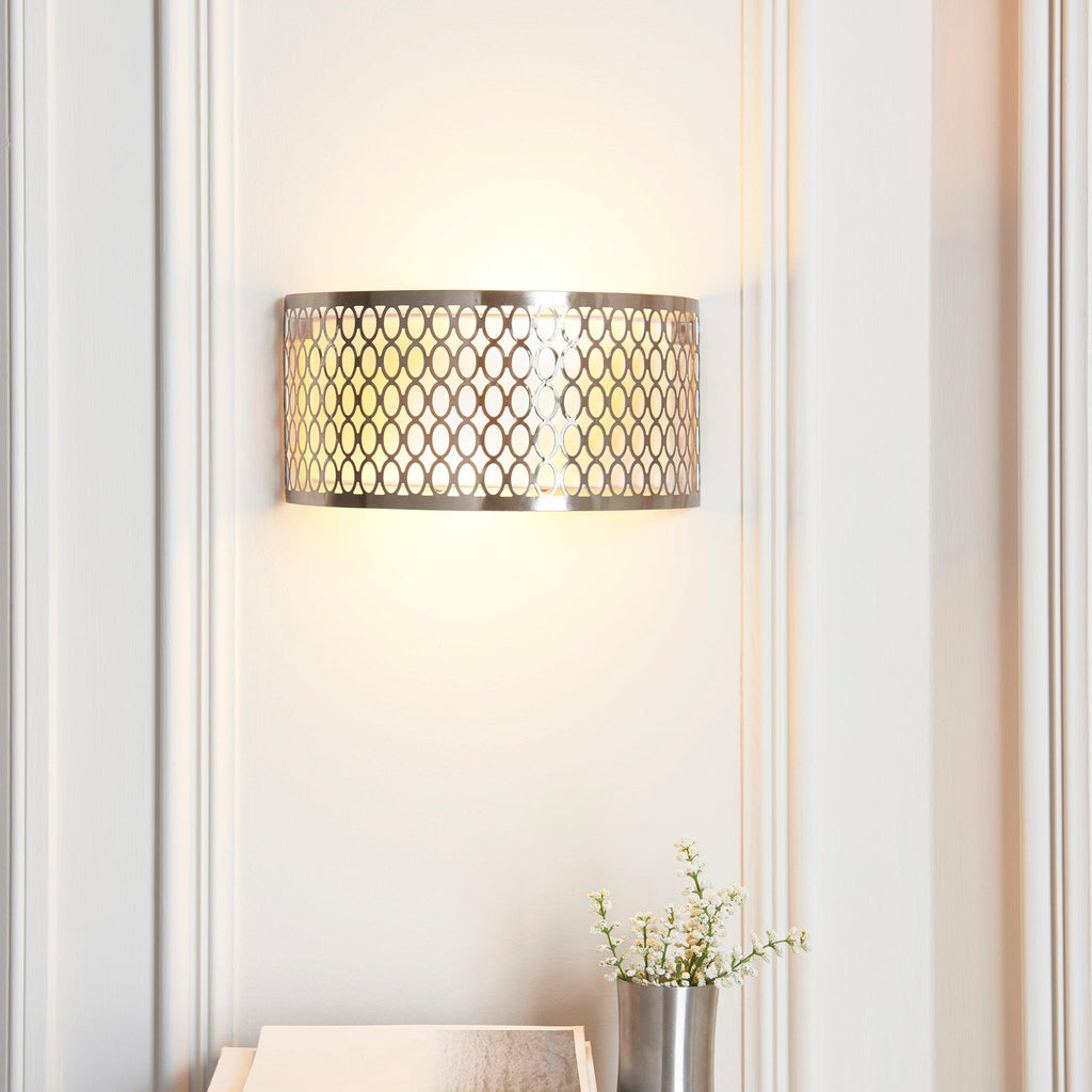 The perfect classic curved wall light, with an elegant geometric metal fretwork outer, is plated in satin nickel effect and has an inner fabric shade for lovely light diffusion, complete with top and bottom frosted glass diffusers to complete the look. Matching items available.