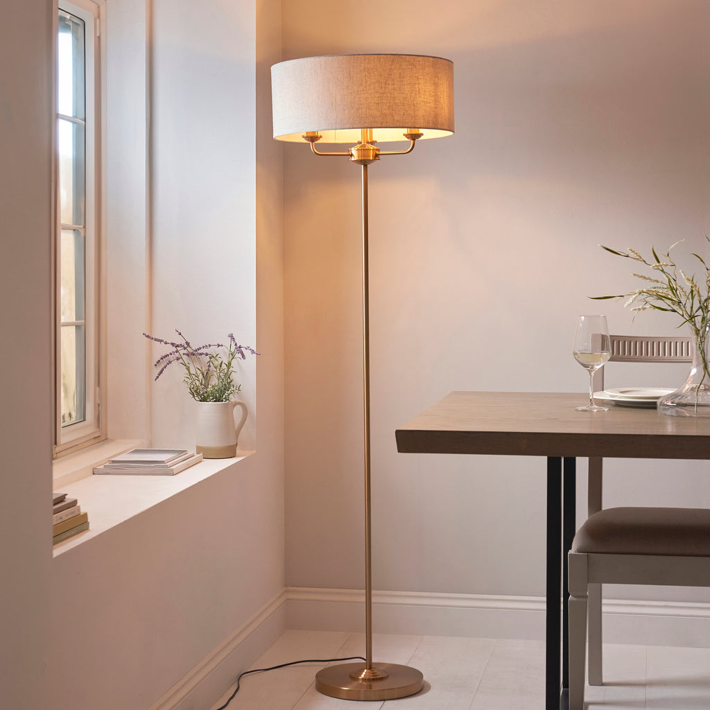 The Highclere 3 light floor light is a sophisticated mix of natural linen fabric shade, with matching colour cotton inner and vintage brass plated metalwork. This statement light is the perfect timeless addition to modern and classic homes.