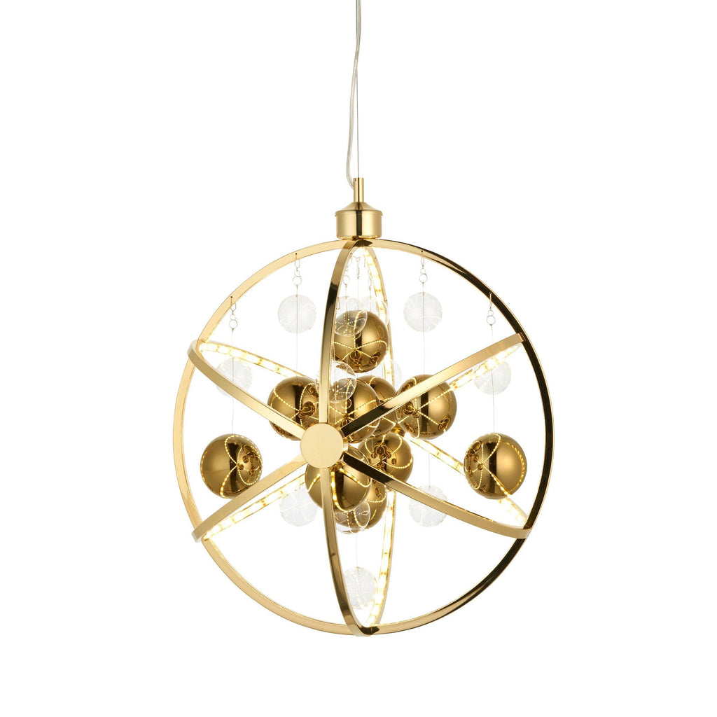 A striking LED pendant with a gold effect plated finish with a mix of clear and gold spheres suspended at various heights within the integrated LED outer rings, creating a stunning modern design.