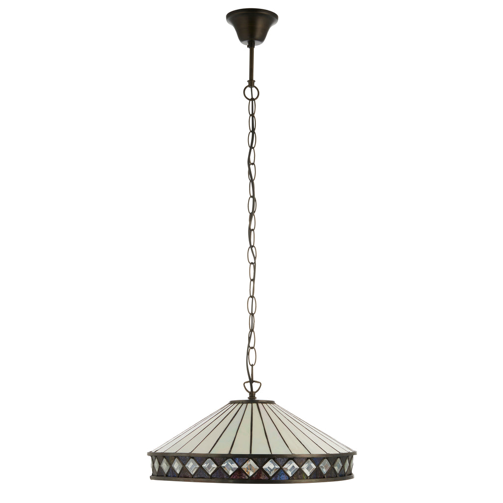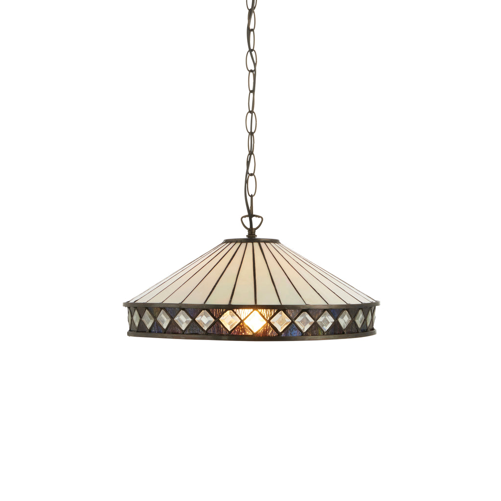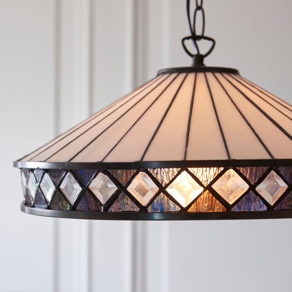The Fargo Tiffany Lighting range by Interiors 1900 is Art Deco simplicity at its best. This lamp was used extensively during the second season of the TV series Mr Selfridge and we can see why. The white glass has an iridescent shimmer that will change colour as you move around the fitting, and is also available as a semi-flush, floor lamp, table lamp, wall light and ceiling pendant. This ceiling light takes a 1 x E27 bulb and will look perfect with a warm white LED bulb, the chain is fully adjustable allowing you to fit it perfectly in your home.