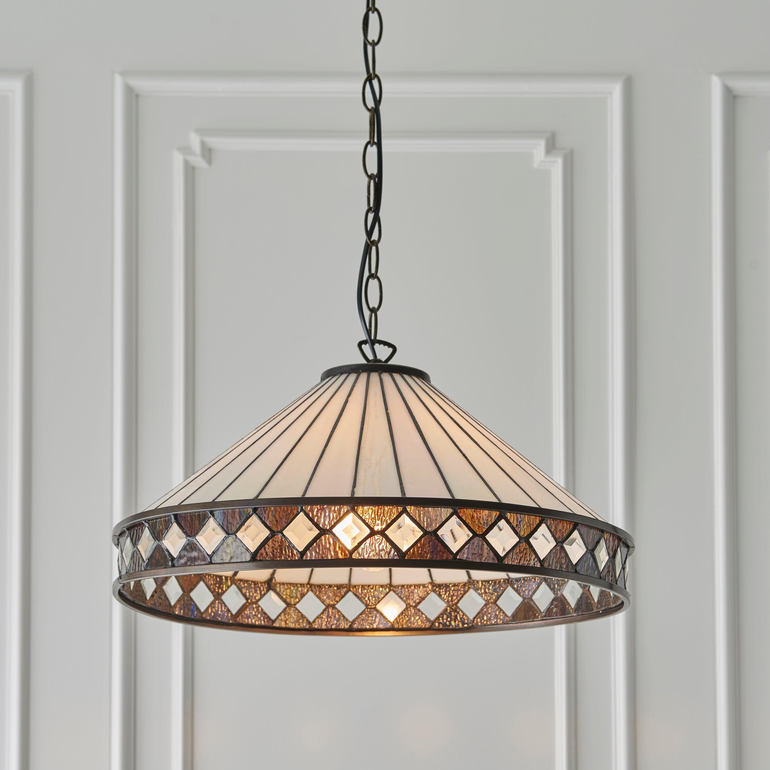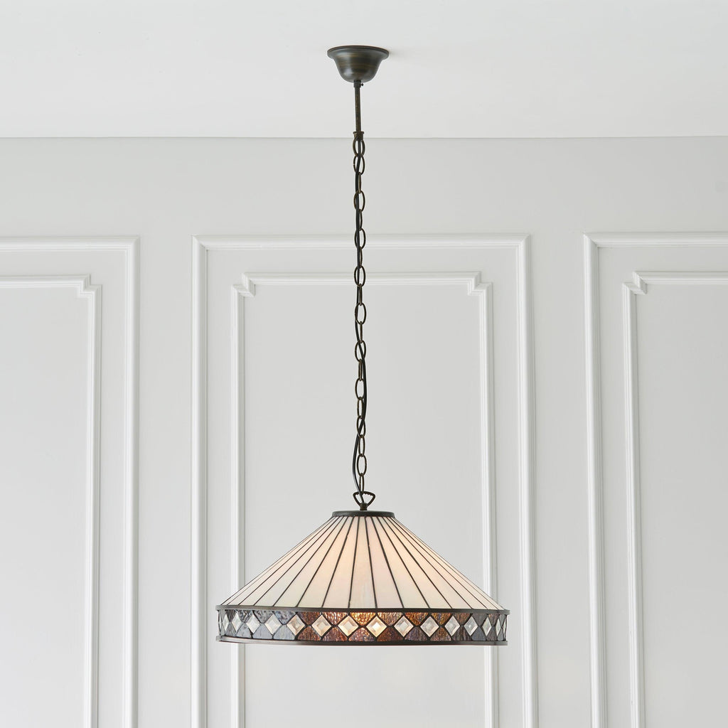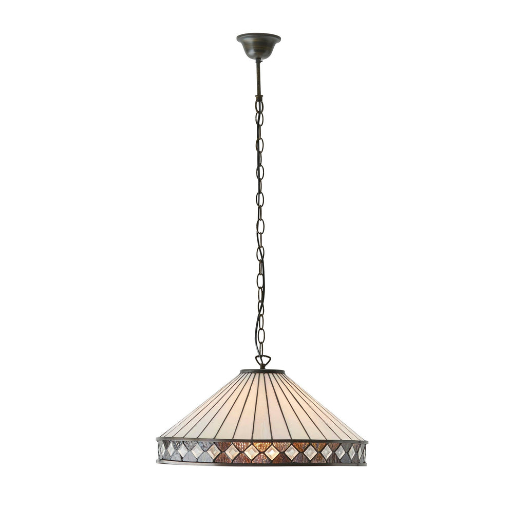 The Fargo Tiffany Lighting range by Interiors 1900 is Art Deco simplicity at its best. This lamp was used extensively during the second season of the TV series Mr Selfridge and we can see why. The white glass has an iridescent shimmer that will change colour as you move around the fitting, and is also available as a semi-flush, floor lamp, table lamp, wall light and ceiling pendant. This ceiling light takes a 1 x E27 bulb and will look perfect with a warm white LED bulb, the chain is fully adjustable allowing you to fit it perfectly in your home.