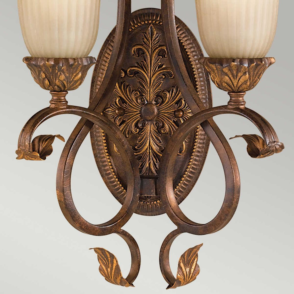 This Feiss Sonoma Valley Aged Tortoise Shell Twin Arm Wall Light by Elstead Lighting is a beautiful light. The cream ridged glass shades are held in place by the delicately detailed sconces, and the curling, curving arms with some lovely leaf detail at each end, bringing to mind the vineyards of Sonoma Valley for which this light is named.