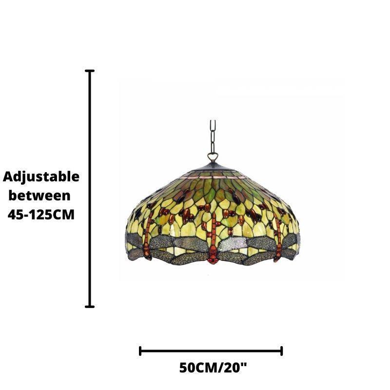This Green Dragonfly Tiffany Ceiling Pendant Light will add a touch of Art Nouveau elegance to any room. Hand cut art glass is used in this fitting to bring you only the very best in Tiffany Style Lighting. The warm greens in this Tiffany Shade have a natural, uplifting feel to them and we think this would look best set against a crisp white wall. The Green Dragonfly Tiffany range includes a floor lamp, a wall light, and an extensive choice of ceiling lights, all in the same beautiful design.