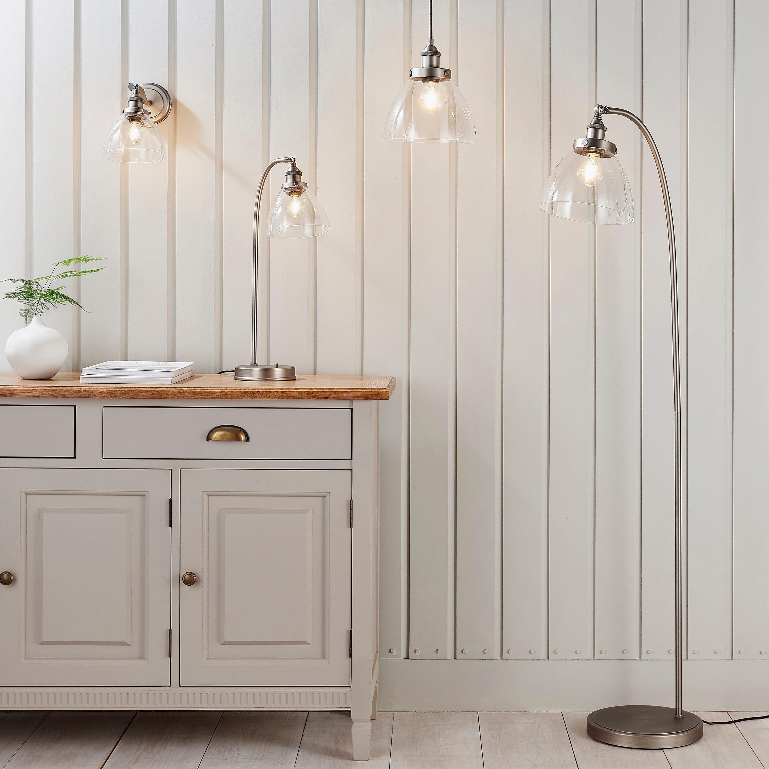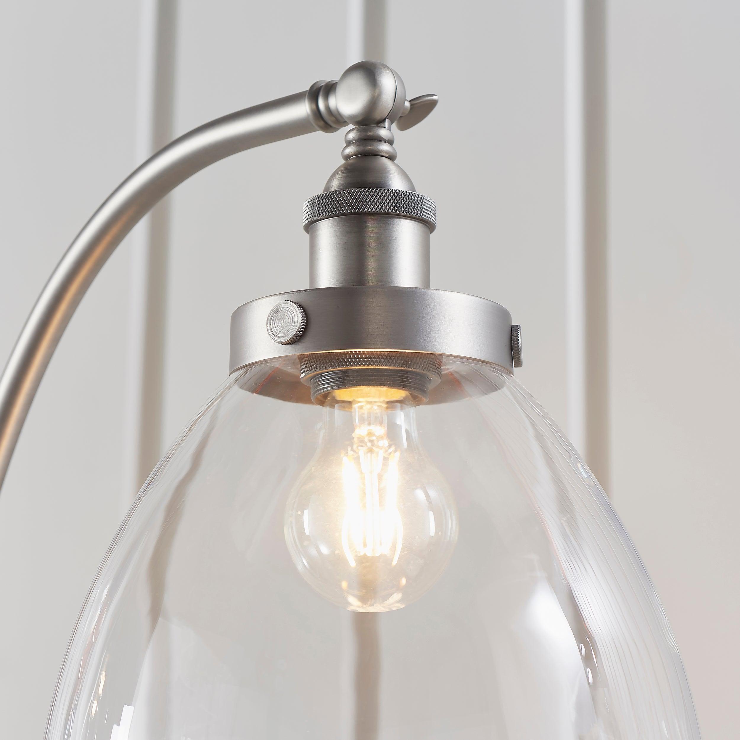 An authentic 'resto' style adjustable floor lamp, finished in brushed silver paint with authentic knurled lamp holder details and clear glass shades. Featuring an adjustable knuckle and accessible on/off switch, pair this table light with filament LED lamps for that perfect industrial style. The perfect addition for today's stylish homes to create that on-trend bar, bistro look.