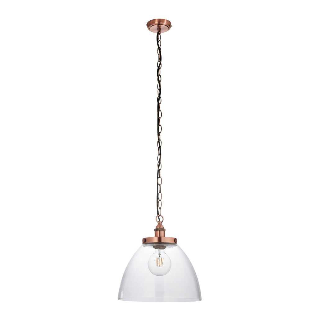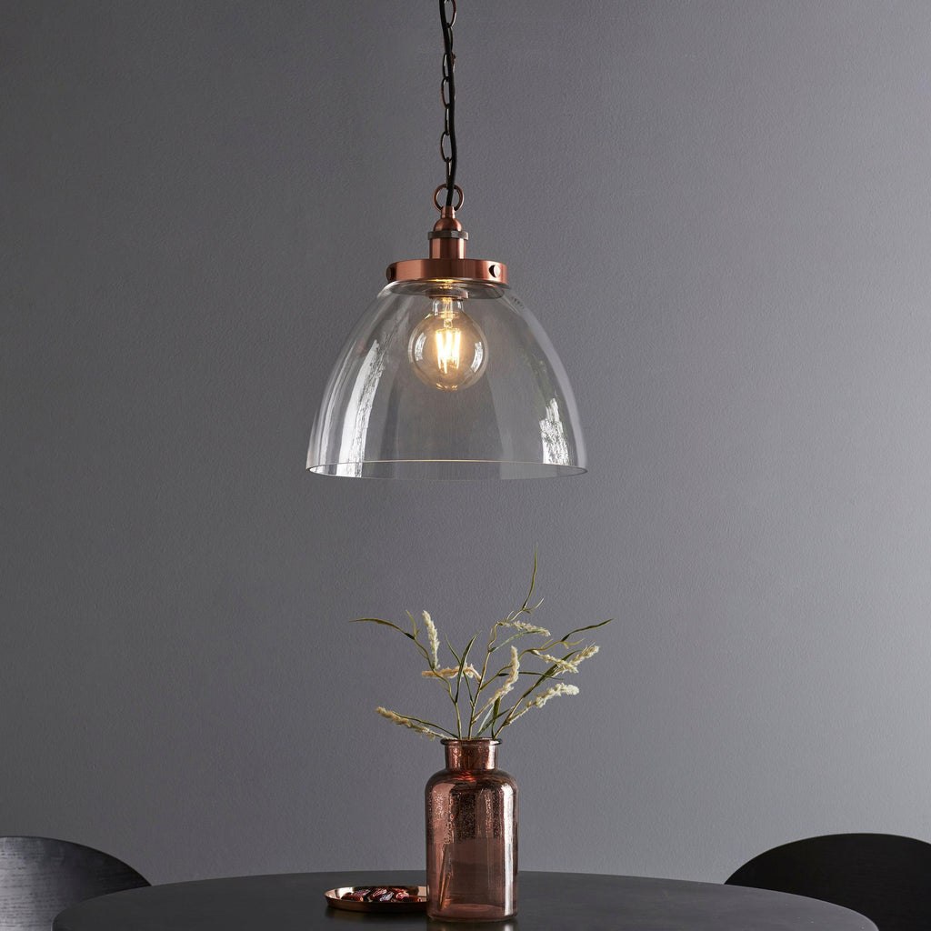 An authentic 'resto' style industrial pendant, finished in aged copper plating with authentic knurled lamp holder details and clear glass shades . Suspended from height adjustable black fabric flex, pair with filament LED lamps for that perfect industrial style. The perfect addition for today's stylish homes to create that on trend bar, bistro look. Also available in other sizes and finishes to complete the look.