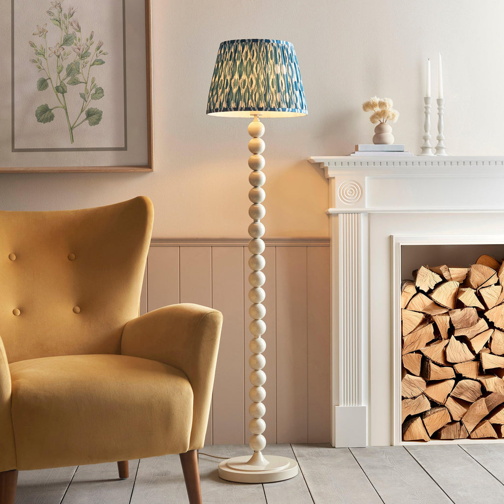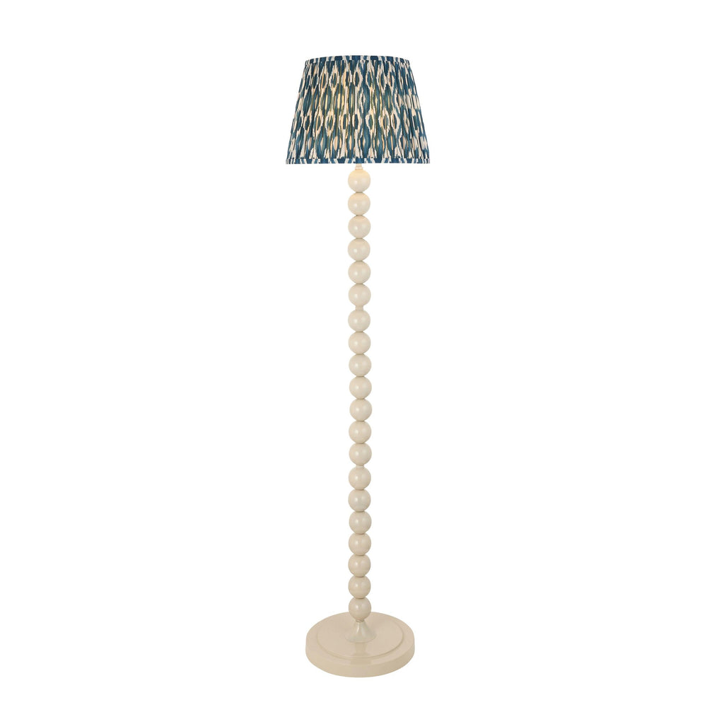 Brighten up your living space with this charming floor light, designed to add a splash of color and personality to your home. Featuring a unique design of multiple stacked metal spheres, elegantly finished in a glossy almond white, this light is not just functional but a statement piece. It comes equipped with an E27 lamp holder, an in-line foot switch for effortless control, and a color-matched fabric flex for a cohesive look. Perfect for creating a cozy reading nook in your living room, this floor light is paired with our stunning marlin blue 35cm Ikat shade, making it the ideal accent to enhance your decor. Enjoy peace of mind with our secure delivery service, easy returns, and a safe online shopping experience. Illuminate your home with style and confidence today!| Height | 153.2cm/60.3" |