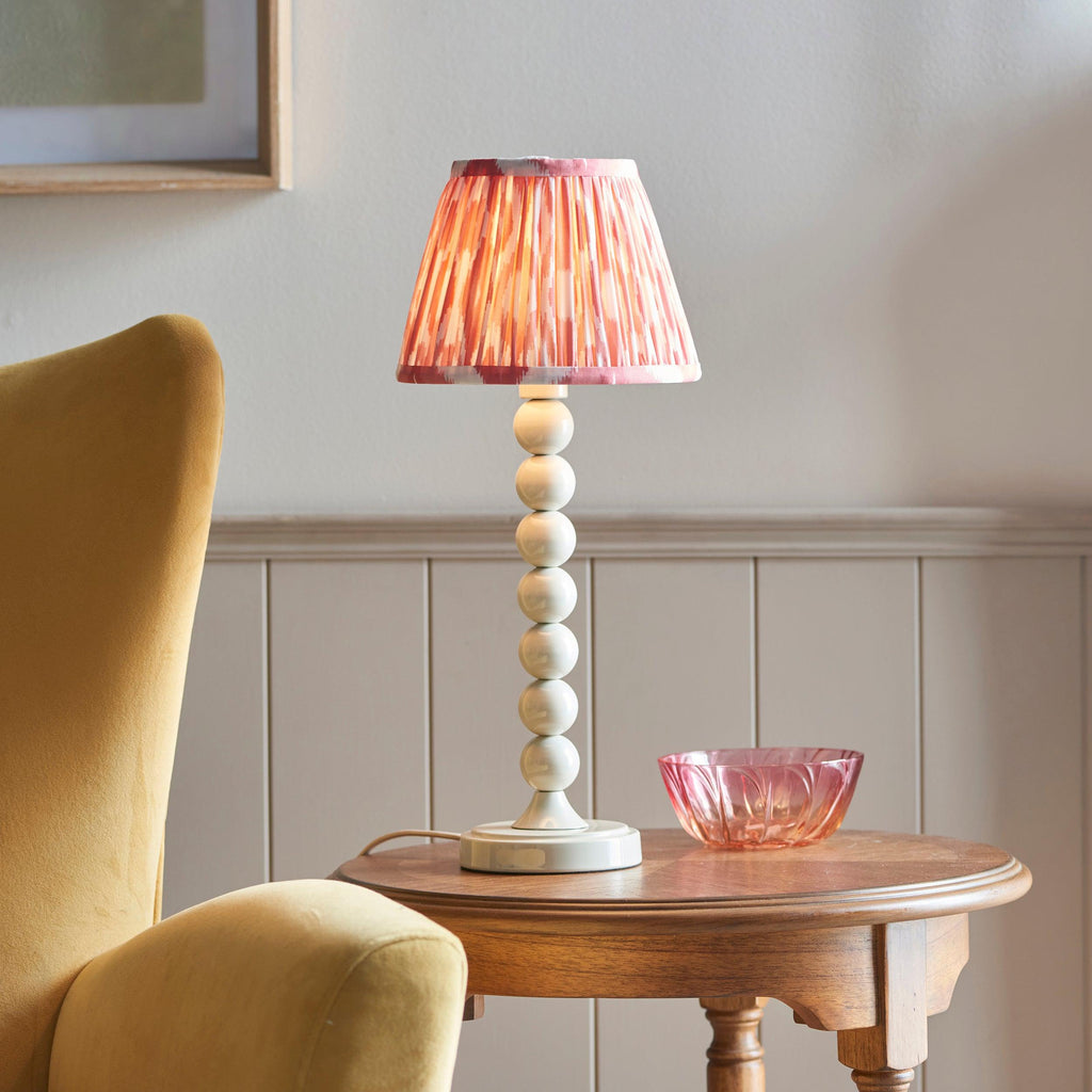 Brighten up your living space with this charming table light, designed to add a splash of color and personality to your home. Featuring a playful design of multiple stacked metal spheres, elegantly finished in a glossy almond white, this light is not just functional but a statement piece. It comes equipped with an E14 lamp holder, an in-line on/off switch, and a color-matched fabric flex for a cohesive look. Perfect for your living room, this table light creates an inviting atmosphere ideal for reading or relaxing with a good book. The vibrant coral pink Ikat 20cm shade beautifully complements the base, making it a delightful addition to any decor. Enjoy peace of mind with our secure delivery service and hassle-free returns, ensuring a safe online shopping experience. Illuminate your home with style and confidence!| Height | 51.4cm/20.2" |
