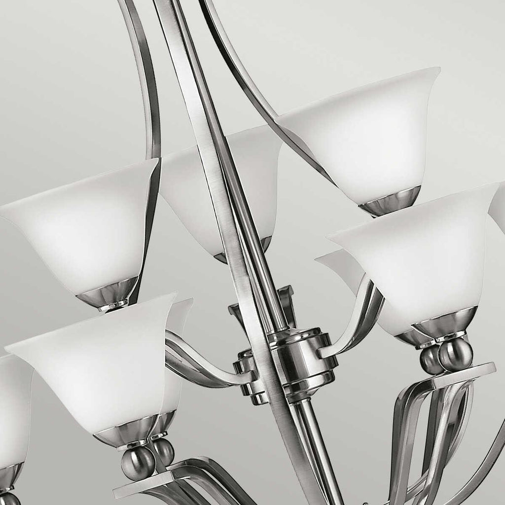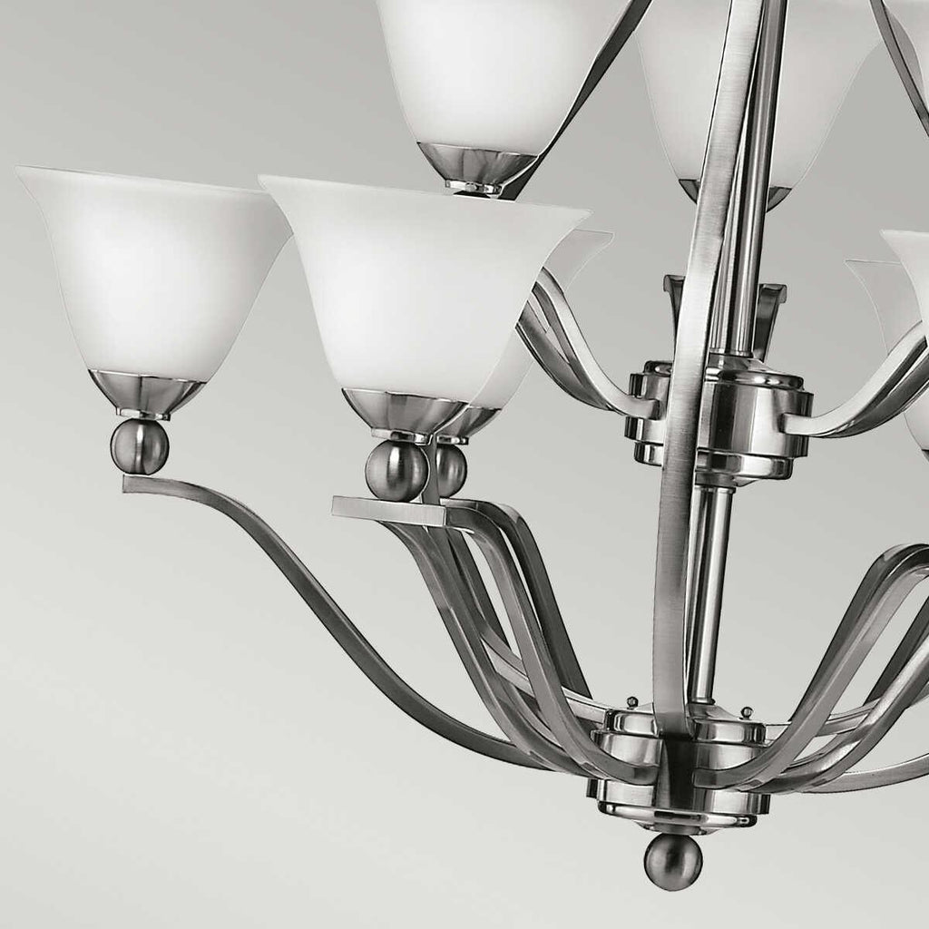 This Hinkley Bolla Brushed Nickel Finish 9 Light Chandelier from Elstead Lighting has a robust, chunky design with two tiers of elegantly curved arms connecting the bell-shaped opal glass shades to the central rod, finished in brushed nickel, with signature metal spheres adding a lovely extra detail.