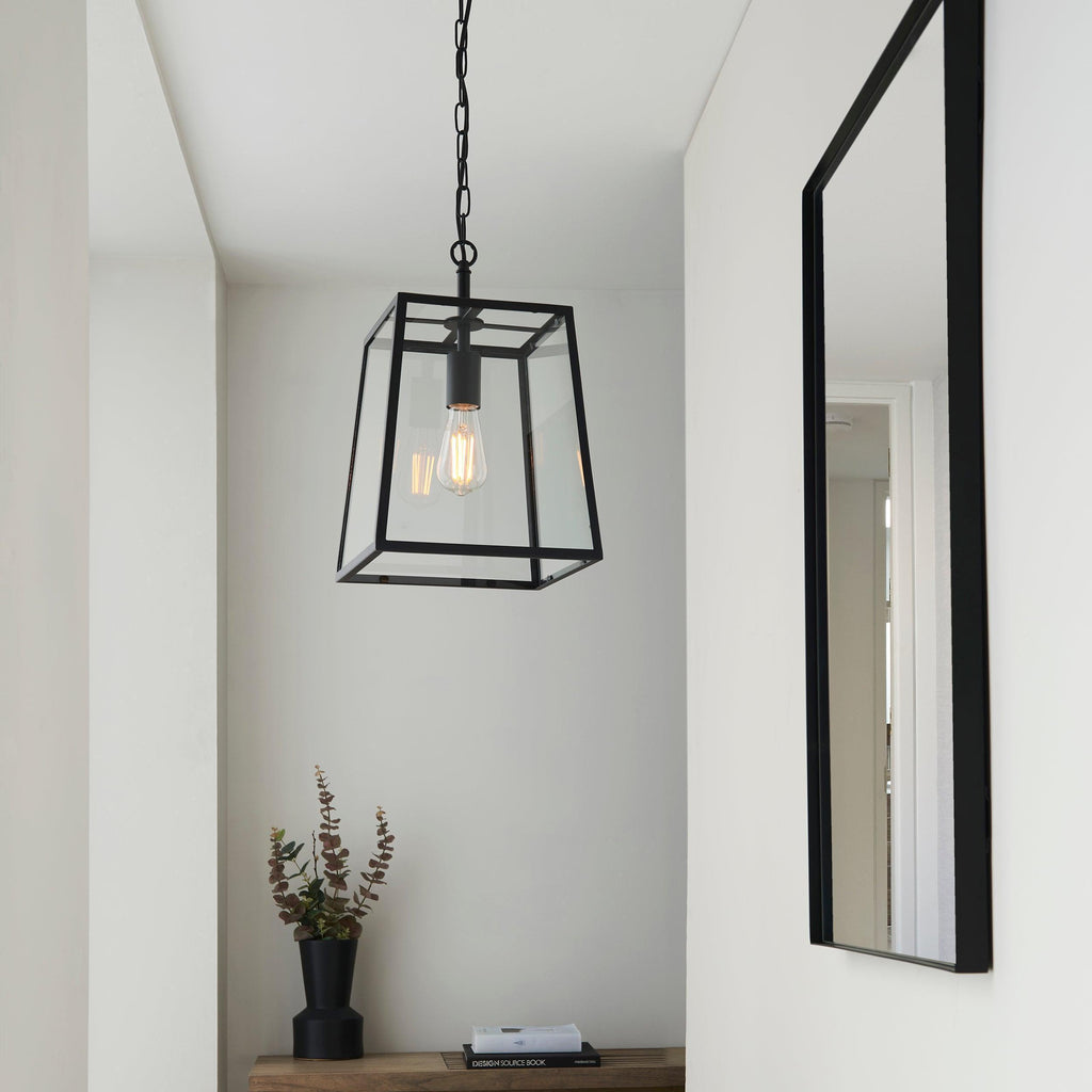 Inspired by box lanterns, this ceiling pendant is the perfect complement for today's relaxed classic interiors. Finished in matt black paint and suspended from a height-adjustable chain with black fabric flex. Pair with vintage-style filament LED lamps that are perfectly framed by the subtle tapered metalwork and large clear glass panels