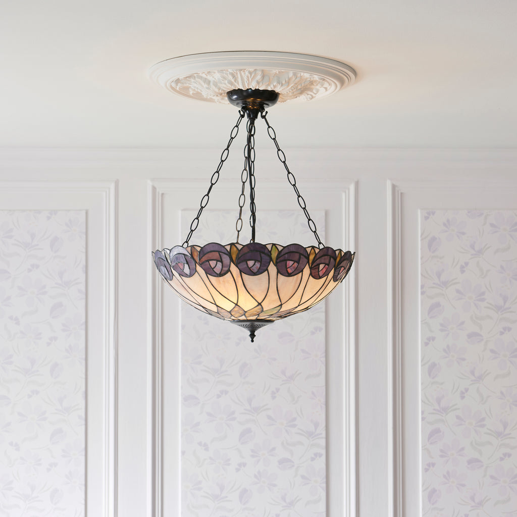 The Hutchinson range by Interiors 1900 combines some absolutely beautiful opalescent art glass with a chic Mackintosh design. Newly released for 2016, it is already proving to be a popular seller. This Large Adjustable Inverted Pendant Light will show off the glass perfectly as well as providing a good source of light. The fully adjustable chain will allow you to install this fitting perfectly. The Hutchinson range includes a choice of ceiling light options, wall lights, and table lamps, all in the same beautiful colours.
