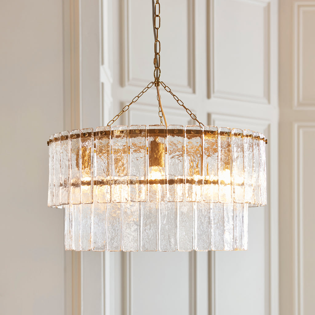Gracefully layered and meticulously crafted, inspired by vintage Venetian art lighting, this 5-light tiered pendant showcases rows of handmade textured glass panels that gently cascade in two tiers, creating a luminous and sculptural centrepiece. Framed in warm metal and suspended from a height-adjustable chain with a refined grey braided fabric flex, it offers a perfect balance of artisanal elegance and contemporary sophistication. Ideal for high ceilings, dining areas, or entryways seeking a statement of understated luxury.