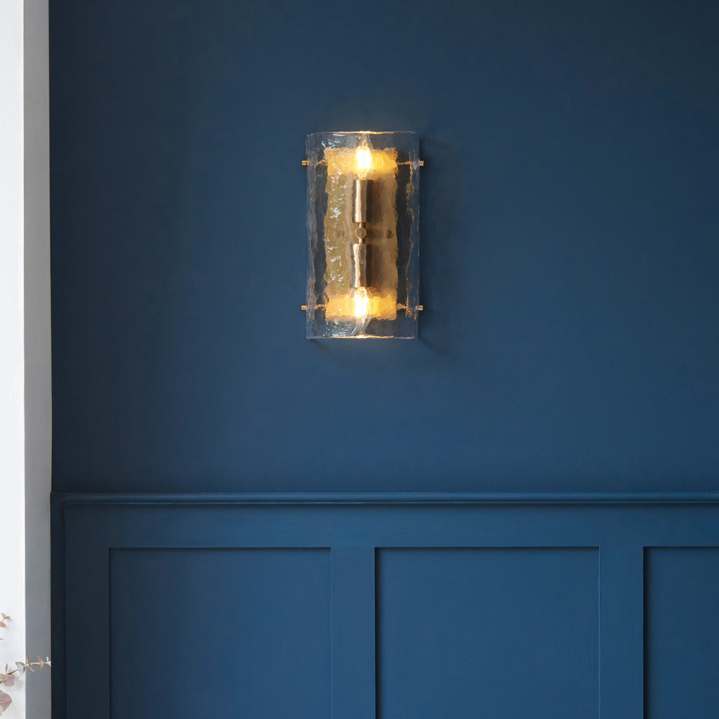 Striking and sculptural, this single light wall fitting showcases a curved panel of handmade textured glass, designed to softly diffuse light while adding dramatic depth and elegance. The artisanal glass captures and reflects the glow from within, creating a warm, ambient effect. Finished with discreet metal fixings, this piece is perfect for hallways, living rooms, or bedrooms seeking a refined timeless touch.