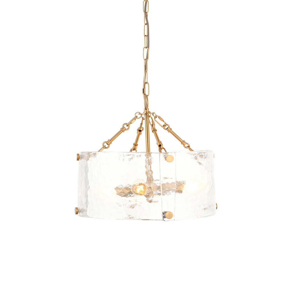 Sculptural and unique, this 4-light pendant features a cylindrical shade formed from thick, handmade glass panels that showcase organic texture and artisanal character. The warm metallic frame and decorative fixings add a handmade touch, while the height-adjustable chain and grey braided fabric flex offer versatility in installation. Ideal for dining rooms, hallways, or living areas, it delivers a soft, ambient glow with a crafted presence.