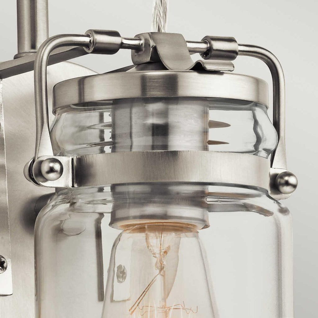 This elegant Kichler Brinley 1 Light Brushed Nickel Wall Light features a sleek, brushed nickel finish that adds a touch of modern sophistication to any living room or bedroom. Its unique design showcases a clear glass shade reminiscent of a classic mason jar, offering a charming blend of vintage and contemporary styles. Perfect for creating a warm and inviting atmosphere, this fixture is compatible with LED lamp bulbs, ensuring energy efficiency and long-lasting illumination. Whether mounted individually or in a series, this Kichler Brinley 1 Light Brushed Nickel Wall Light is an ideal choice for enhancing the ambiance of your home.