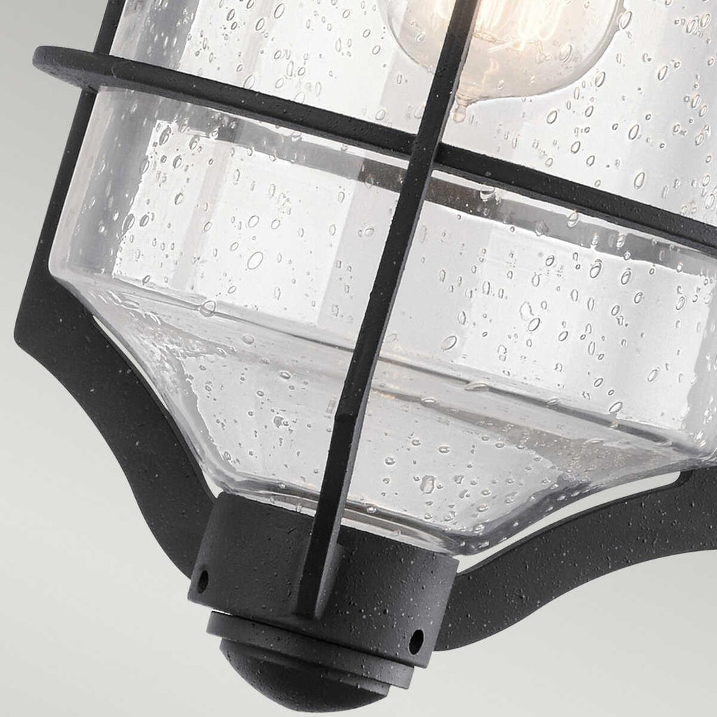 The Kichler Royal Marine Medium Black Outdoor Wall Light features a classic lantern design with a robust black finish, making it an elegant addition to any exterior space. Its clear seeded glass panels encase the bulb, providing a warm and inviting glow while enhancing the fixture's vintage charm. The sturdy construction ensures durability against the elements, making it perfect for exterior lighting. Ideal for illuminating entryways, patios, or garden paths, this wall light combines functionality with timeless style, adding a touch of sophistication to your outdoor decor.