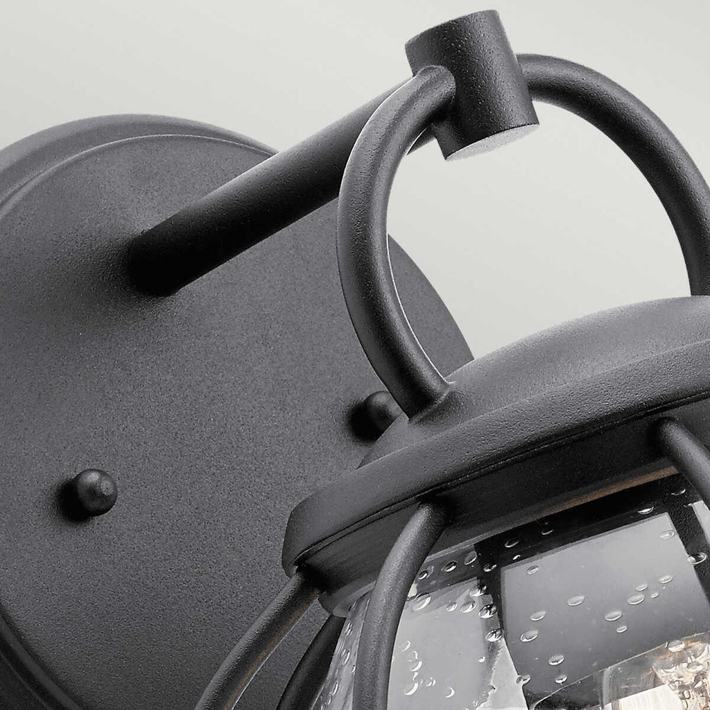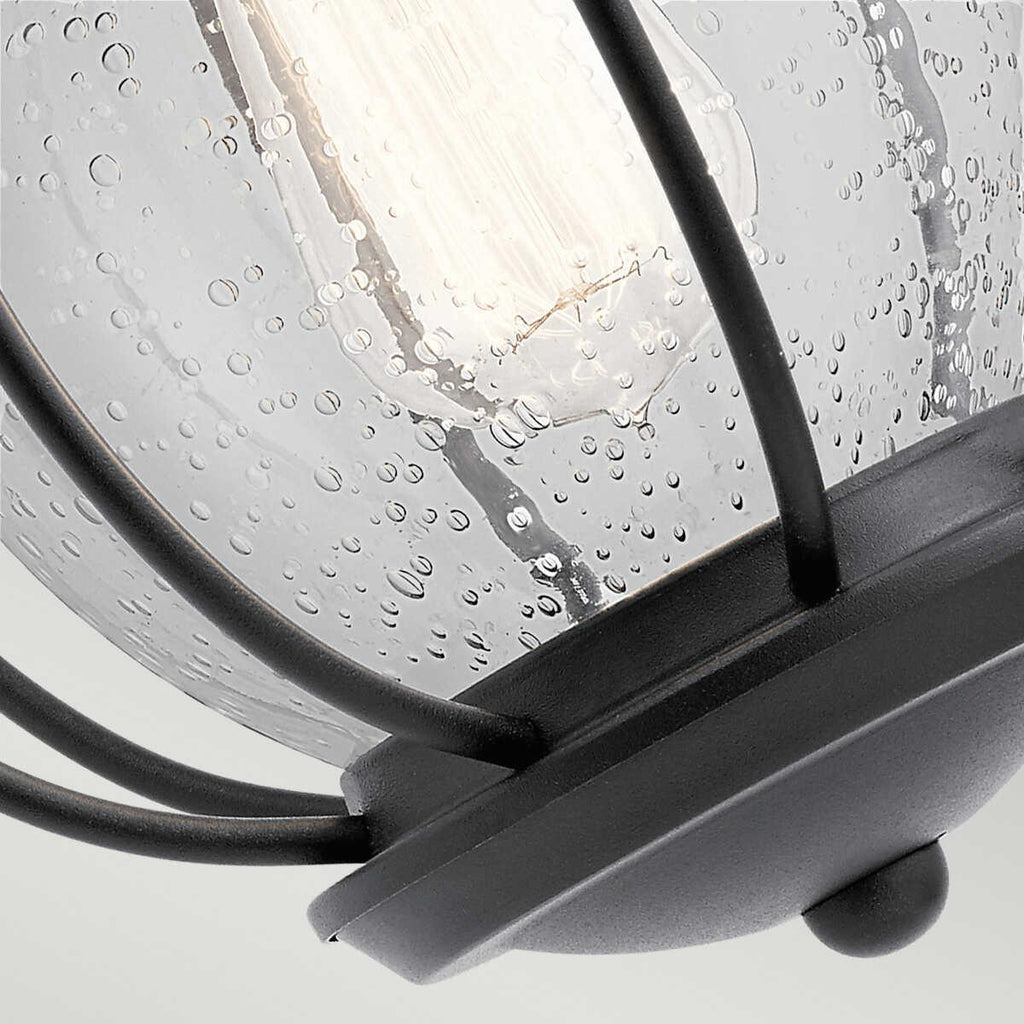 The Kichler Vandalia Outdoor Black Wall Light features a classic and elegant design, perfect for enhancing the ambiance of any exterior space. Its robust metal frame is finished in a sleek black, providing a timeless look that complements various architectural styles. The light is encased in a clear seeded glass globe, which not only adds a touch of sophistication but also ensures a warm and inviting glow. Ideal for illuminating pathways, patios, or entryways, this fixture combines durability with style, making it an excellent choice for exterior lighting solutions.
