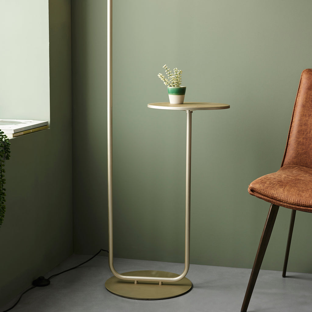 A modern mix of lighting and furniture design perfect for contemporary living. Strong in form with a satin champagne finish and slate grey fabric shade featuring an integrated table for everyday objects. Matching items available.