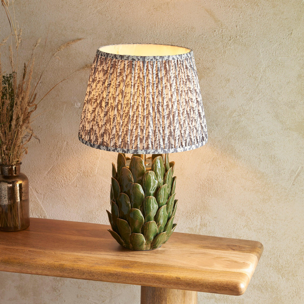 Elevate your dining room ambiance with our exquisite ceramic table light, inspired by the elegant opening leaves of an artichoke. The rich dark olive reactive glaze adds a touch of luxury to your home, while the brushed aged brass B22 lamp holder and black braided fabric flex enhance its sophisticated design. Complete the look with our subtle pearl grey 35cm Leaf shade, perfect for creating a warm and inviting atmosphere for reading or entertaining guests. Enjoy peace of mind with our secure delivery, easy returns, and a safe online shopping experience. Transform your space with this stunning table light and indulge in the perfect blend of style and functionality.| Height | 58cm/22.8" |