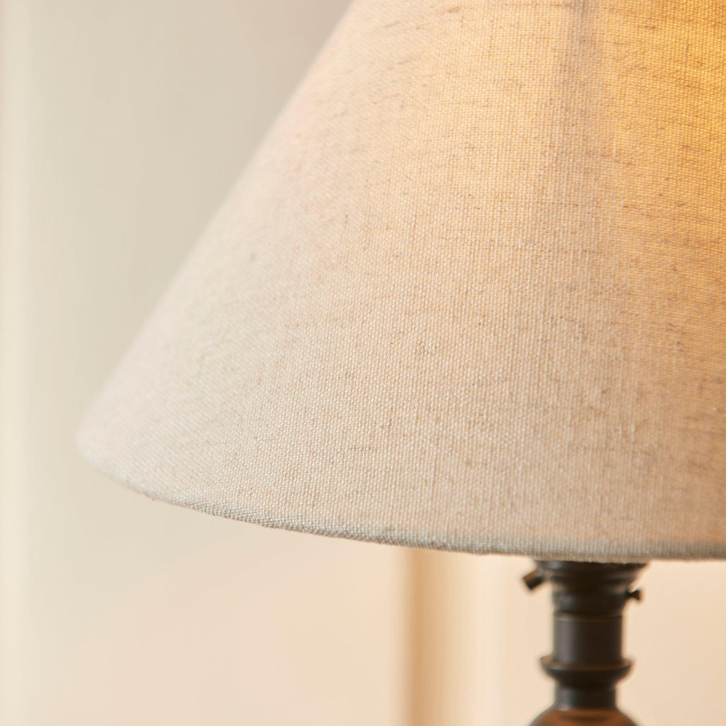 This elegant table light is inspired by traditional candlestick designs and is finished in matt black, featuring a timeless 22cm tapered shade in natural linen fabric. Complete with a switched B22 lamp holder for an authentic classic look, making it the perfect table light to be proud of. Matching items available.