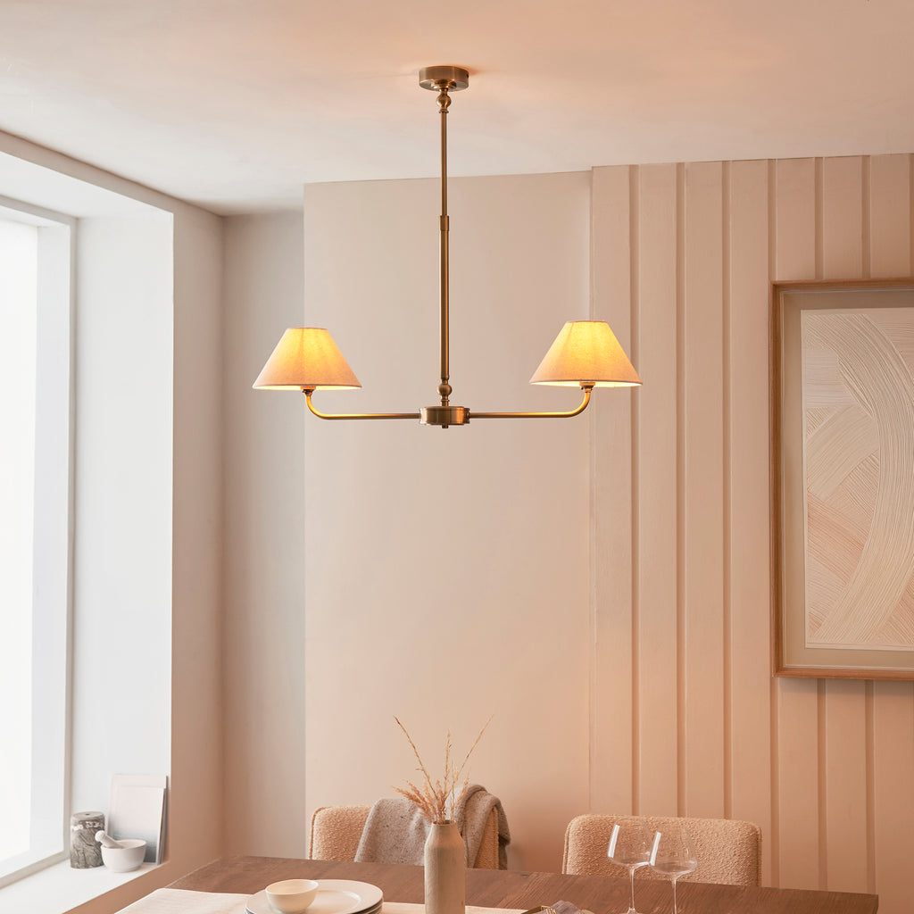 This elegant 2 light pendant is finished in antique brass plate and features timeless tapered shades in natural linen fabric. Its linear shape makes it perfect for positioning over dining tables and comes complete with a height adjustable telescopic stem and B22 lamp holders for an authentic classic look. Matching items available.