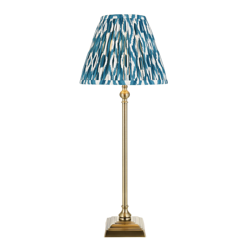 This elegant table light is inspired by traditional candlestick designs and is finished in antique brass plate, featuring our vibrant marlin blue 25cm Ikat shade for the perfect timeless style. Complete with a switched B22 lamp holder for an authentic classic look, making it the perfect table light to be proud of. Matching items available.
