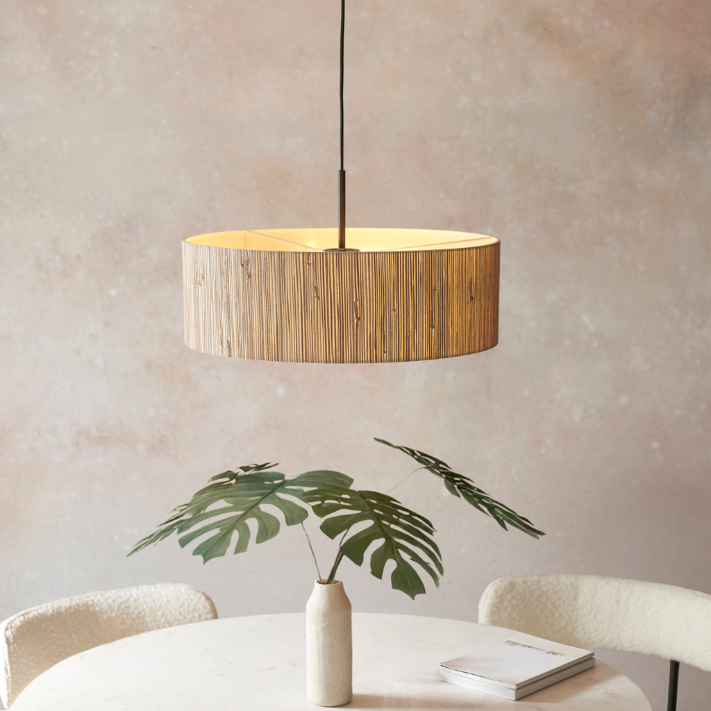 Bringing organic texture and warm simplicity to any space, this single pendant features a cylindrical shade woven from natural seagrass. Its earthy tones and linear weave add depth and a touch of rustic elegance, while the soft fabric diffuser below casts a gentle, even glow. Ideal for dining areas, bedrooms, or relaxed living spaces, it blends effortlessly into both coastal and contemporary interiors. Suspended from black flex with matt black ceiling cover.
