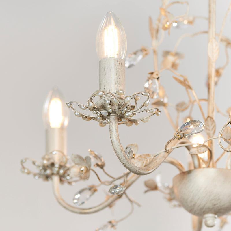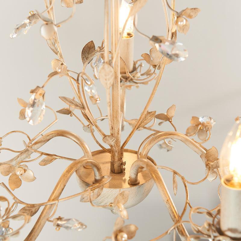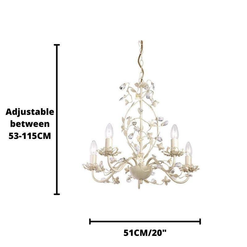 The Lullaby Cream And Gold Painted 5 Light Chandelier by Endon Lighting is a stunning chandelier. The attention to detail in the intricate floral design is enhanced by the decorate glass flower buds, and the glass beading below each sconce, to create an elegant light that will make a statement in any room.