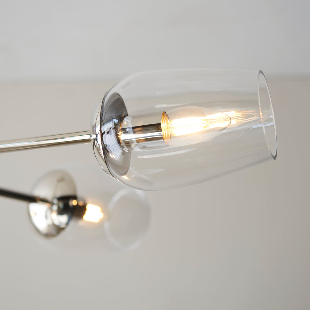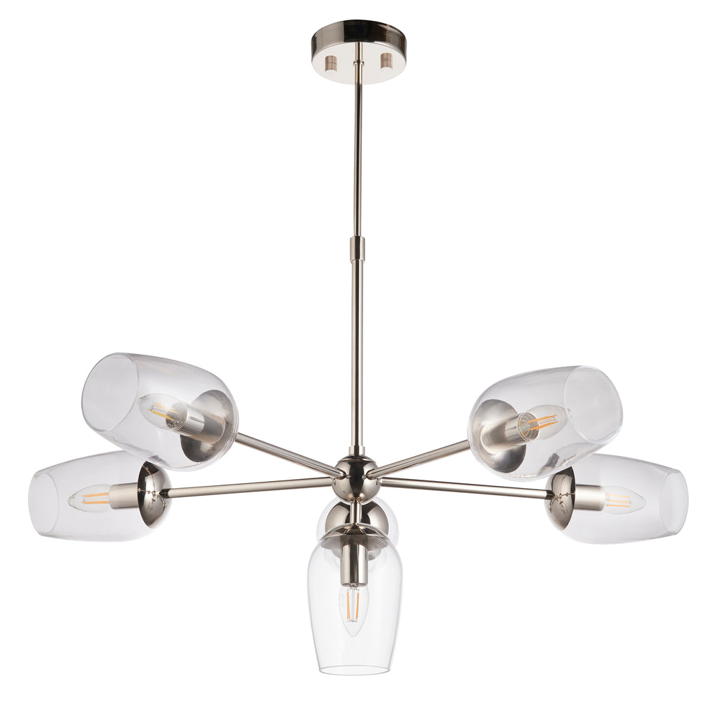 The Maeve 6 Light Nickel Pendant combines elegant design with versatile functionality, making it an ideal centrepiece for dining areas and living rooms. Its bright nickel-plated metal arms are slender and refined, supporting six clear blown glass shades that offer a contemporary yet timeless appeal. The pendant features a height-adjustable telescopic stem, allowing precise customisation to fit various ceiling heights and room layouts. Designed to be dimmable, it enhances ambience while ensuring energy efficiency when paired with E14 LED lamps. Crafted with attention to detail, this fixture delivers both style and practicality for sophisticated interiors.