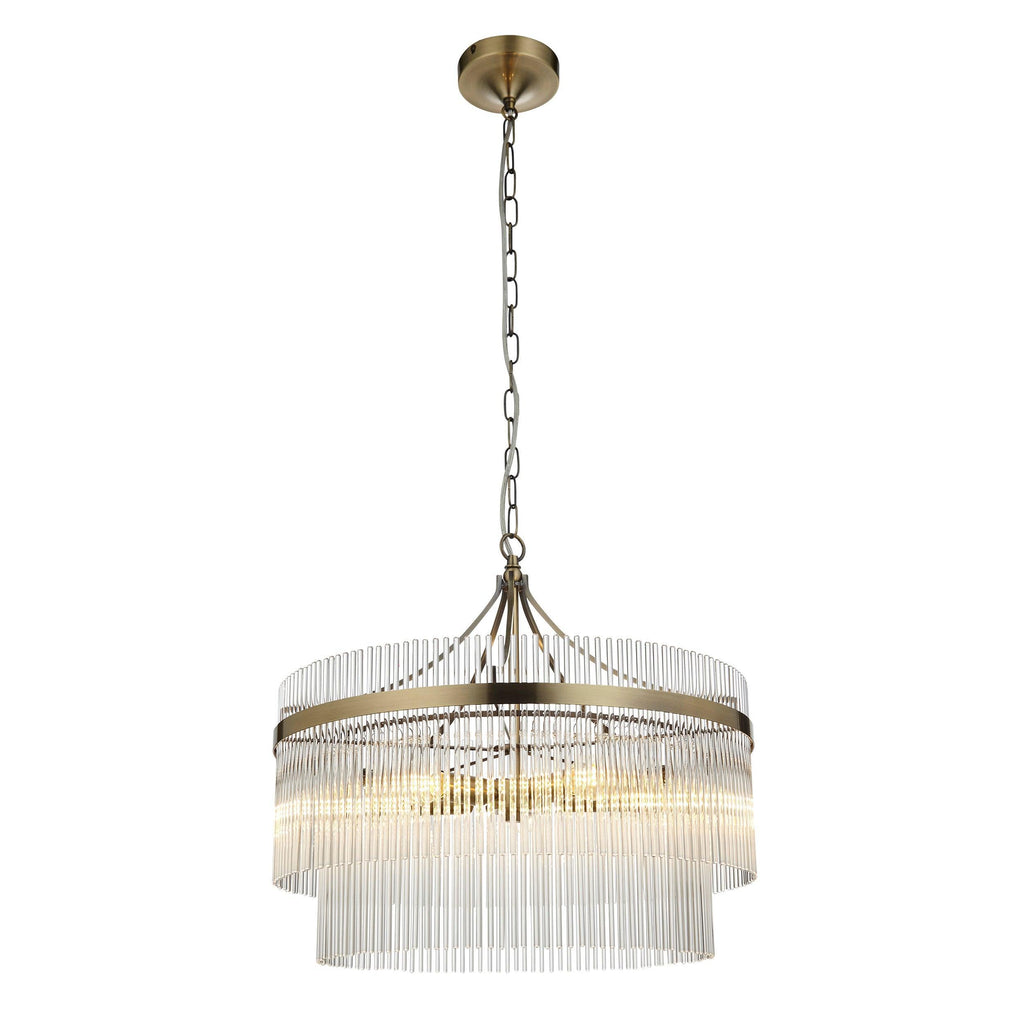 A beautiful contemporary interpretation of the chandelier in antique brass plated finish. Decorative clear glass rods diffuse the light to create an inviting ambience. The chain can be adjusted to suit ceiling height and allow it to be perfectly hung above dining tables or in living spaces. Coordinate your home lighting beautifully with matching wall lights and brass ceiling lights
