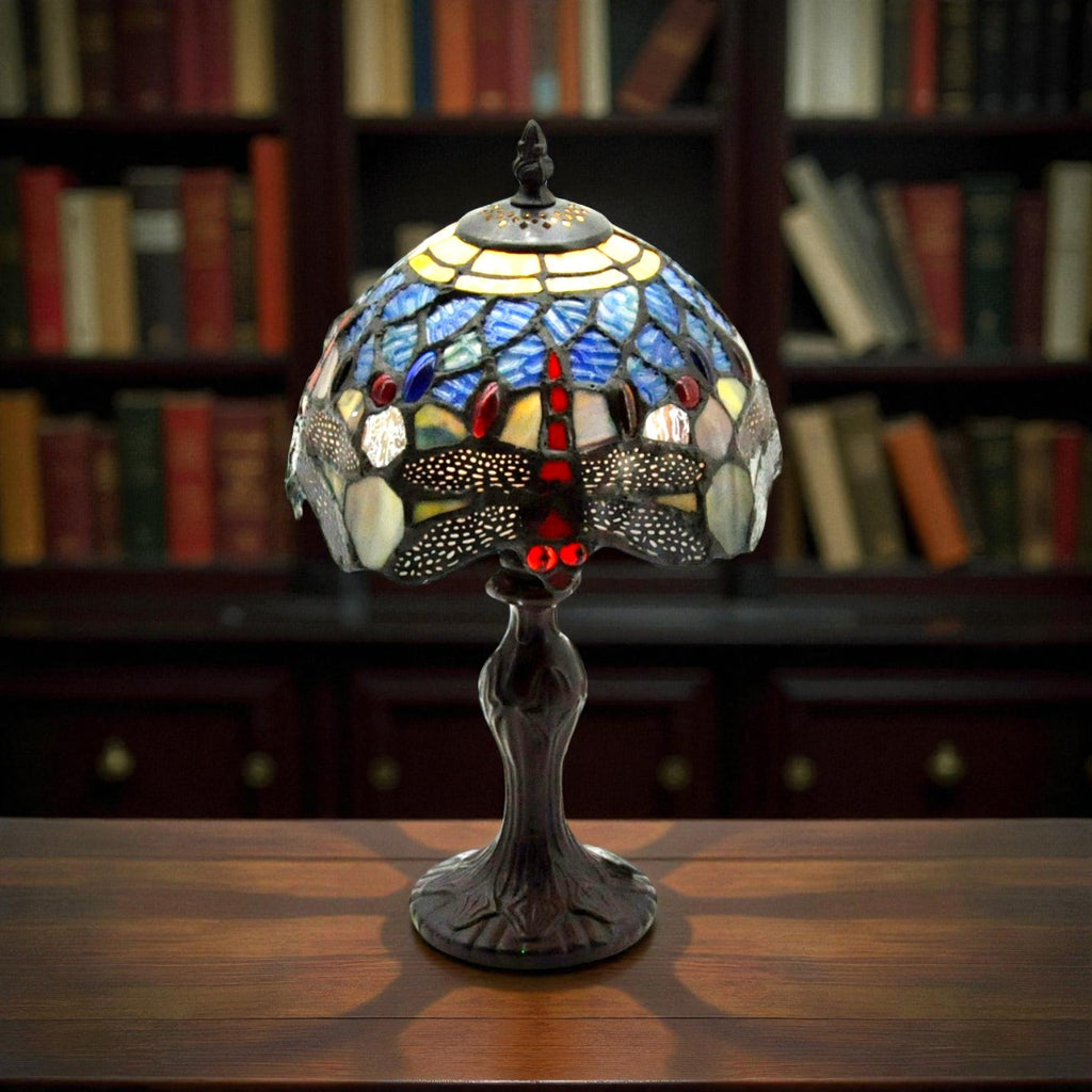 Crafted using time-honoured Tiffany methods, this 20cm table lamp showcases hand-cut stained glass panels in captivating blue dragonfly patterns, unified through traditional copper foil assembly. The rich, jewel-toned glass diffuses light with refined sophistication, making it an ideal companion for bedside tables, home offices, or living spaces requiring atmospheric illumination. Every shade is individually handmade, ensuring no two lamps are identical, a testament to authentic artisanal production. The lamp combines a dependable electrical system with a sturdy foundation, guaranteeing both longevity and visual impact. Perfect for discerning collectors and those drawn to period-authentic lighting that marries genuine heritage craftsmanship with enduring elegance and warm, enveloping radiance.