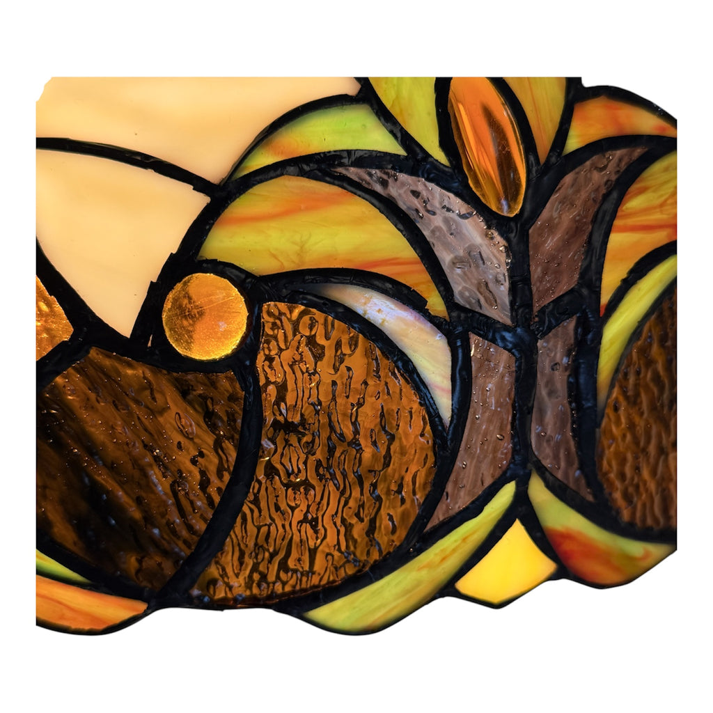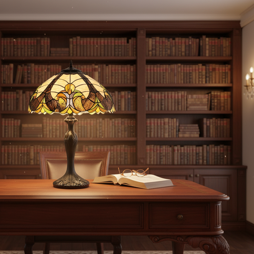 Bring timeless elegance into your home with this beautifully crafted Tiffany-style table lamp. Featuring a richly coloured stained-glass shade in warm amber and beige tones, the intricate design creates a soft, atmospheric glow that instantly adds character to any space.