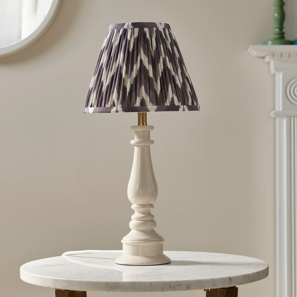 Introducing our exquisite table light, inspired by the elegance of classic turned staircase spindles. Finished in a stunning high gloss almond white resin, this piece features a switched B22 brass lamp holder and a delicate pale braided fabric flex, making it a perfect addition to your living room. Ideal for creating a cozy reading nook, this lamp not only illuminates your space but also enhances your decor with its timeless country luxe aesthetic. To complete the look, we've paired it with our chic 25cm pearl grey Zigzag shade, adding a touch of sophistication to any setting. Enjoy peace of mind with our secure delivery service, easy returns, and a safe online shopping experience. Elevate your home with this beautiful table light today!| Height | 52cm/20.5" |