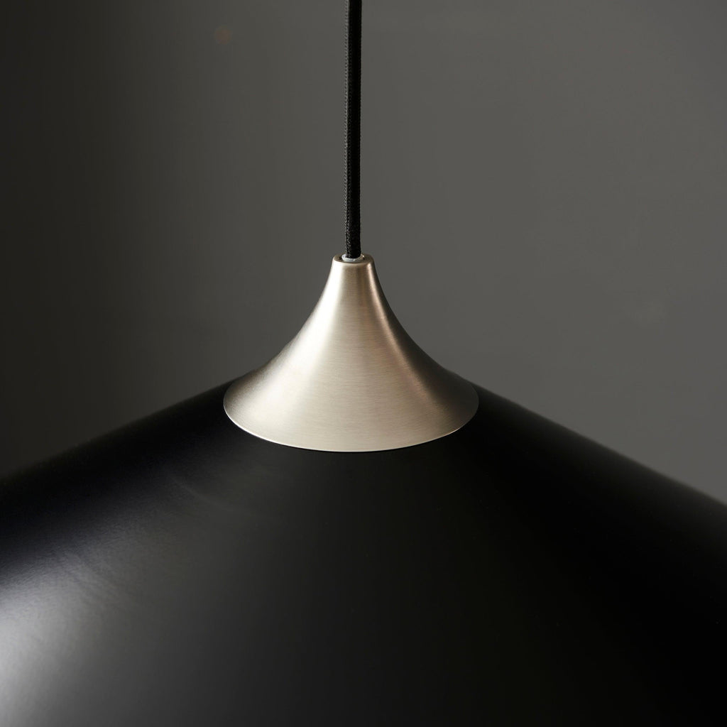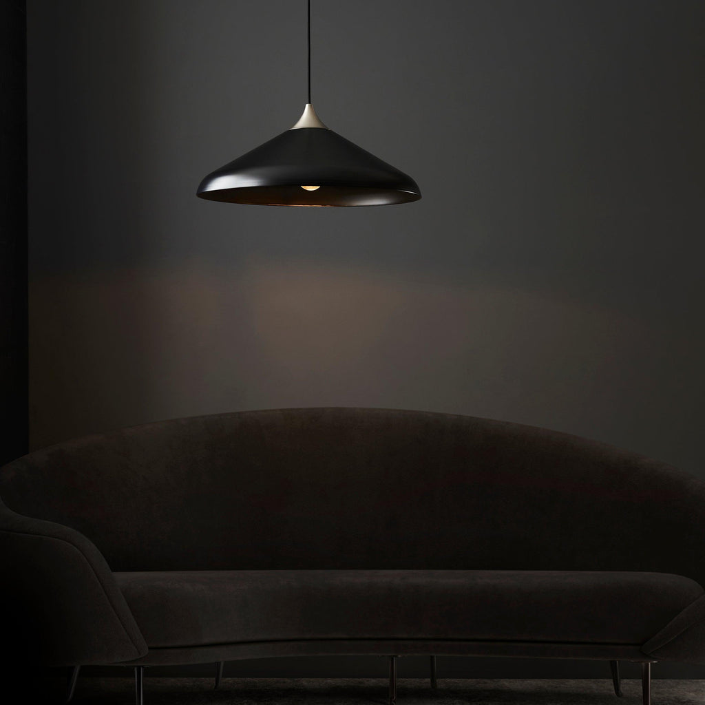 Guaranteed to bring instant contemporary style to your interior, this tapered dome-shaped pendant features clean lines and a pared-back aesthetic. Available in a matt black finish with matt nickel details or warm white with brushed brass details. Combine with matching items from the range for a coordinated look.