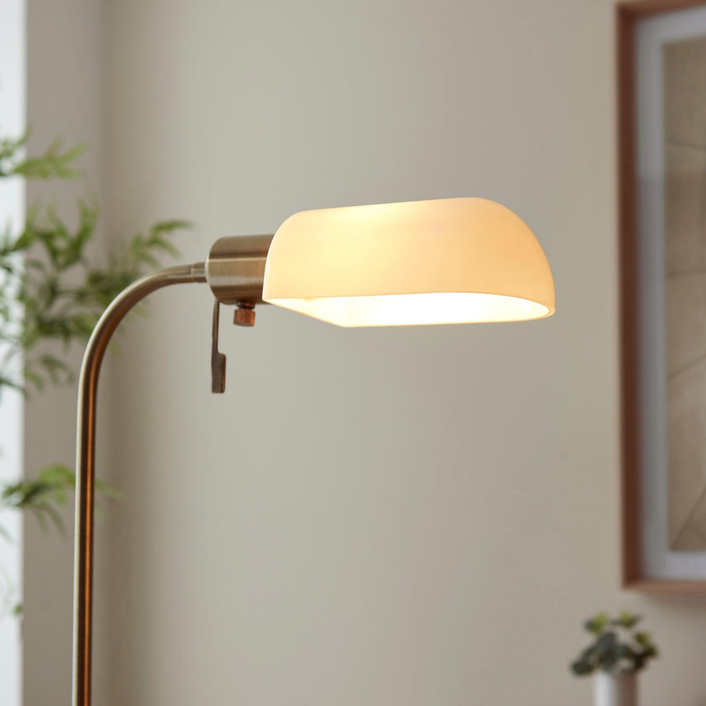 Classic styling meets functionality in this timeless style height adjustable reading light, with gloss opal glass shade creating a beautiful ambient glow. The shade can be rotated to where it is most required. Finished in antique brass with an easy-to-reach rotary on/off switch and black PVC flex.