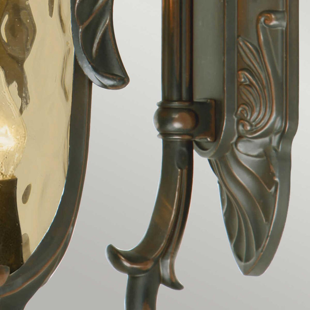The��Philadelphia Old Bronze Finish Large Outdoor Downlighter Wall Lantern from Elstead Lighting is part of a large range of period lanterns with lovely scrolled metalwork and intricate detailing. The range includes large, medium and small uplighter and downlighter wall lanterns, as well as pedestal, pillar, pendant and lamp post lanterns. The Philadelphia range also gives you a choice of a black finish with clear blown glass, or Old Bronze Patina finish with amber blown glass.