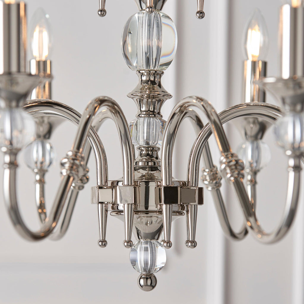 This Polina Chandelier from Interiors 1900 is a stunning light - a lovely traditional chandelier with a more contemporary polished nickel finish which is complemented by the clear crystal glass inserts. The Polina range offers a vast choice of ceiling lights, as well as wall lights, table and floor lamps, and a choice of polished nickel or antique brass finishes, and many of the lamps are available with or without shades.