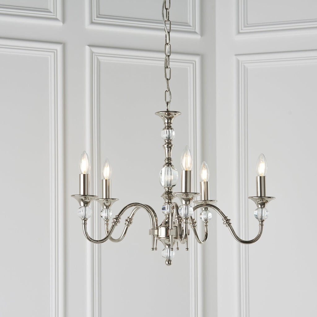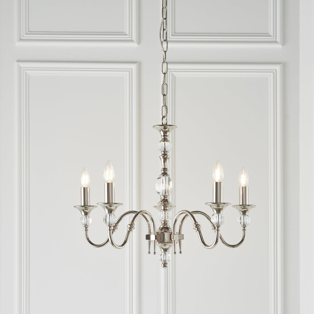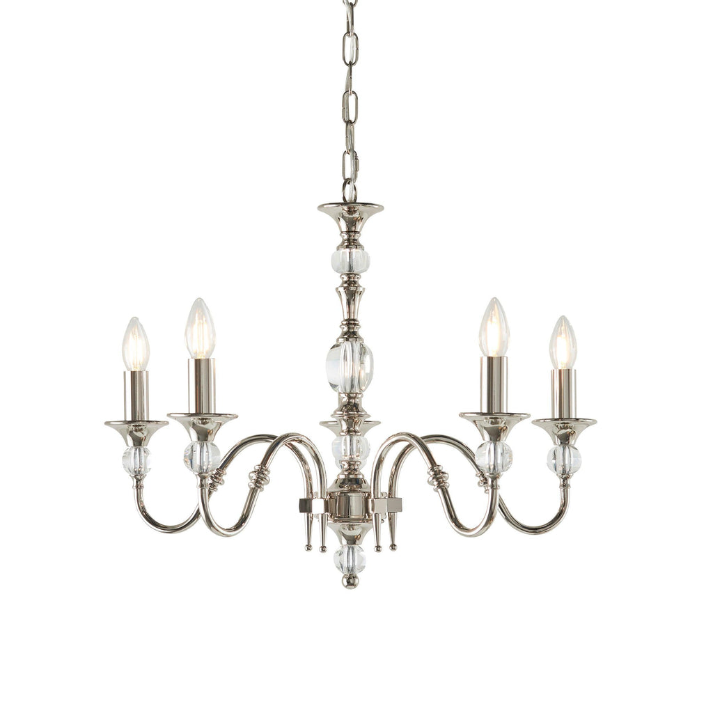 This Polina 5 Light Chandelier from Interiors 1900 is a beautiful traditional chandelier with a stunning polished nickel finish which is complemented by the clear crystal glass spheres. The Polina range offers a vast choice of ceiling lights, as well as wall lights, table and floor lamps, and a choice of polished nickel or antique brass finishes, and many of the lamps are available with or without shades.